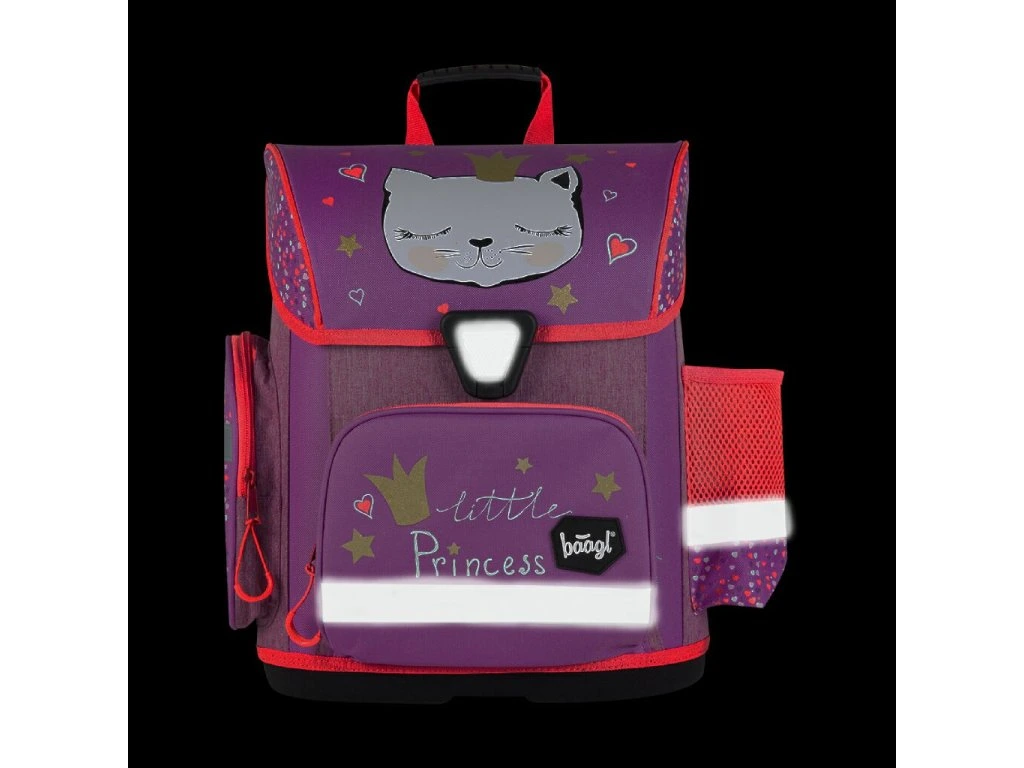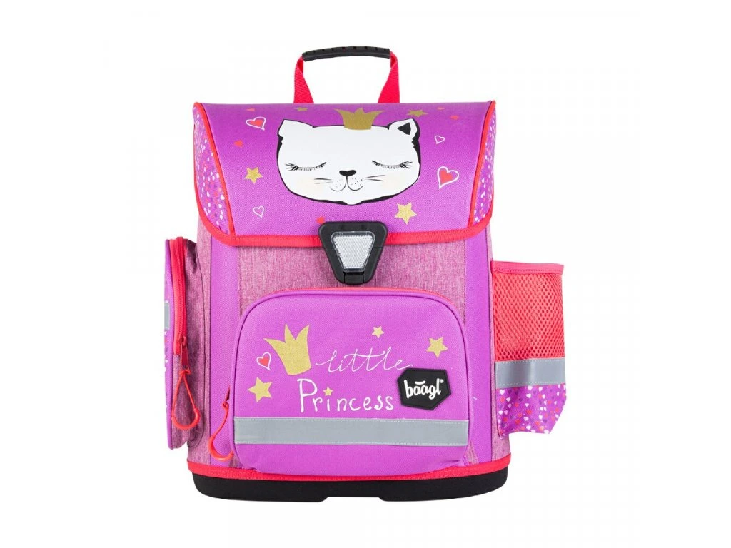 Školní aktovka s obrázkem kočky na přední části, vhodná pro žáky 1.–2. třídy ZŠ.