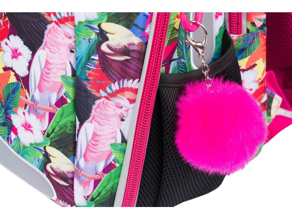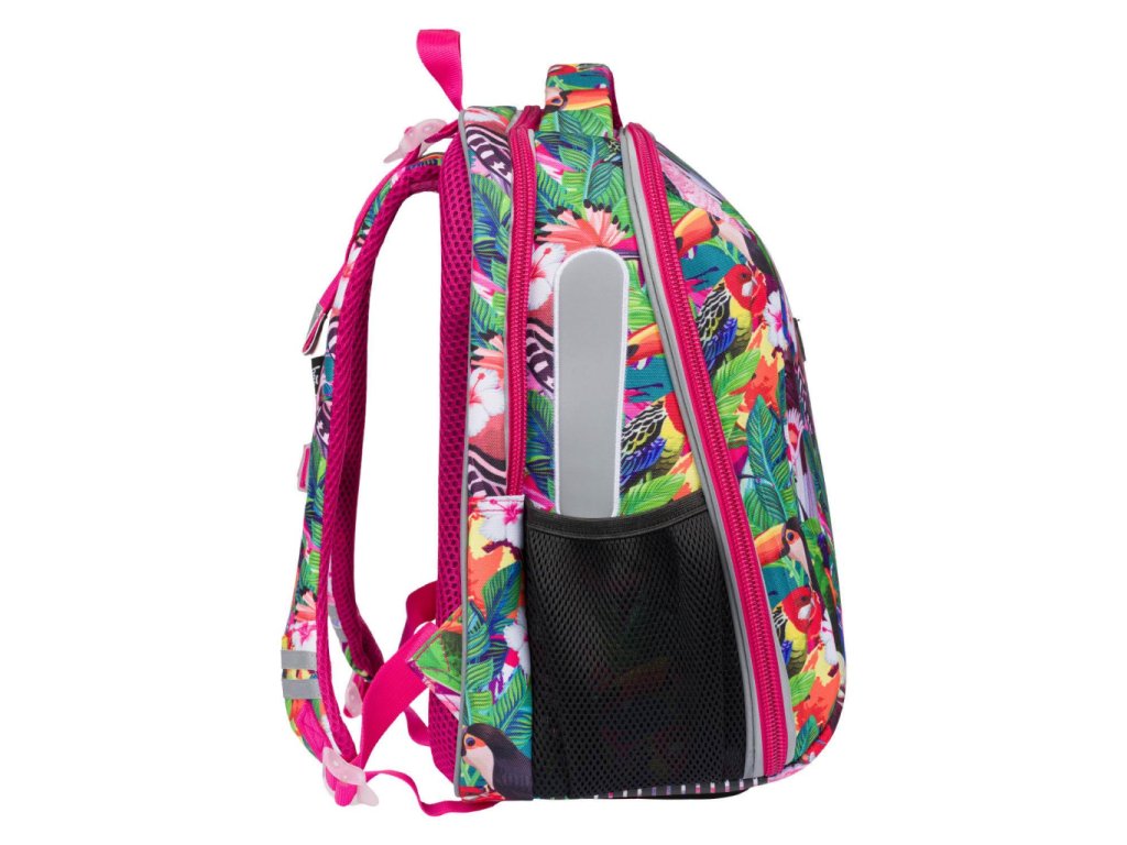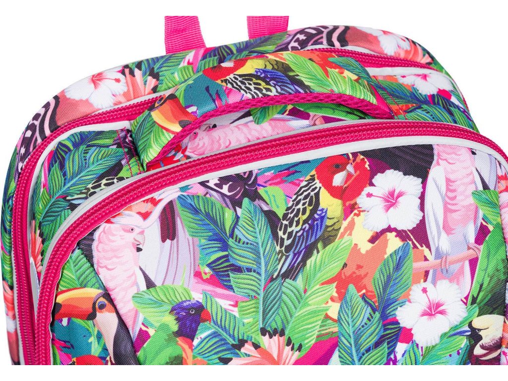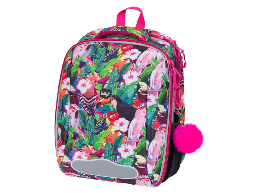 Dvoukomorová skořepinová aktovka Shelly Tukan s potiskem exotických papoušků, vhodná od 1. třídy ZŠ.