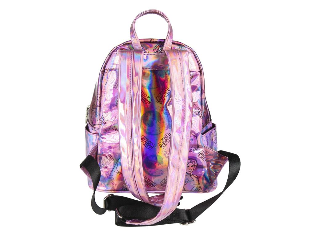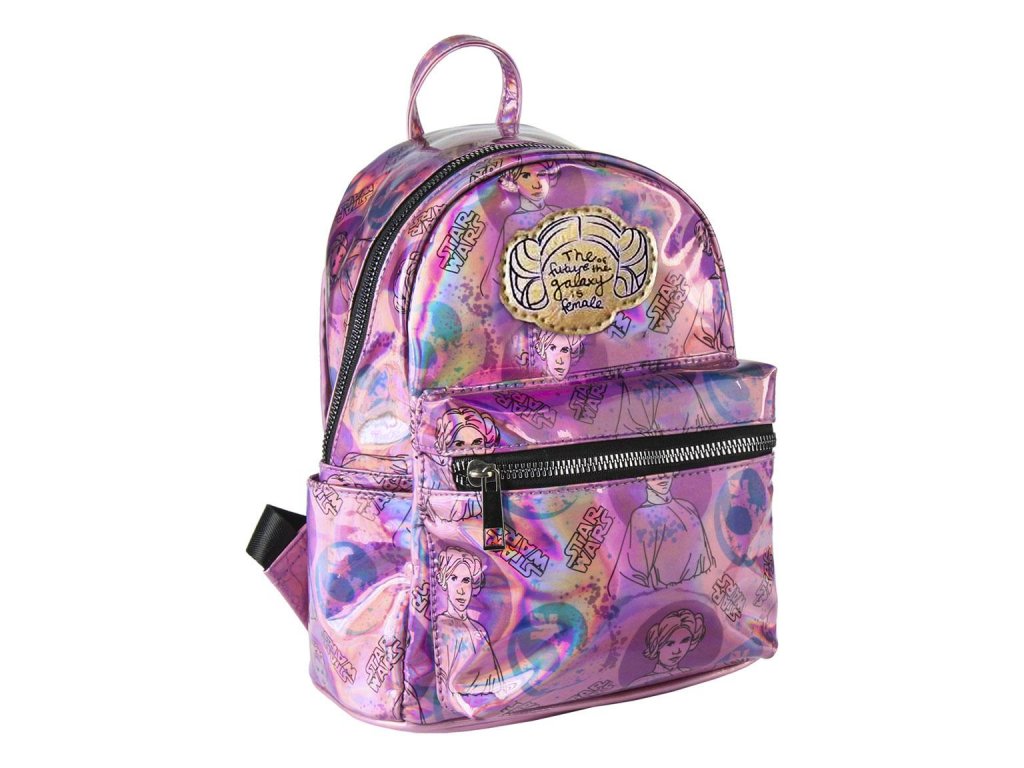 Atraktivní růžový koženkový batoh s motivem princezny Leiy a nápisem "The future of the Galaxy is Female". Batoh vyznávající kombinaci elegance a hravé povahy.