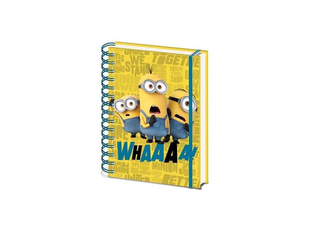 Linkovaný blok A5 v kroužkové vazbě s motivem překvapené partičky Mimoňů.