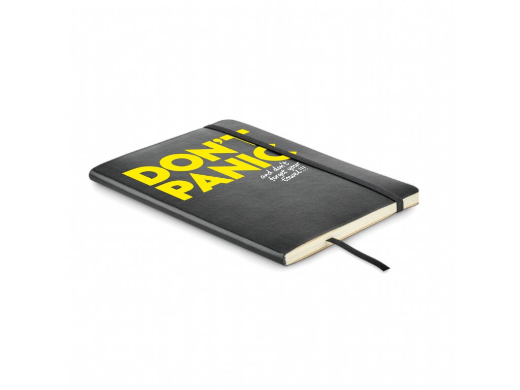 Linkovaný blok formátu A5 se zavíráním na gumičku, záložkou a vnitřní zadní kapsou. Měkkou obálku zdobí výrazný nápis DON´T PANIC z kultovní knihy a filmu The Hitchhiker's Guide to the Galaxy.