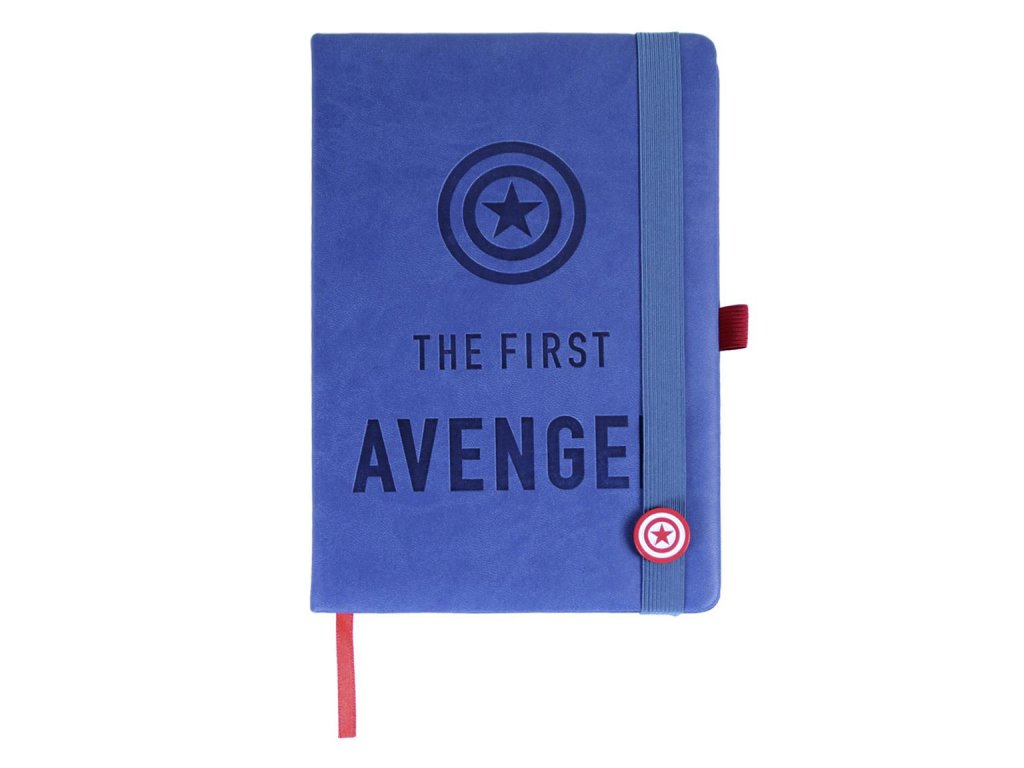 Modrý zápisník s motivem a logem Prvního Avengera - Kapitána Ameriky. Blok obsahuje také mnoho stylových detailů, které potěší každého fanouška Marvelu.