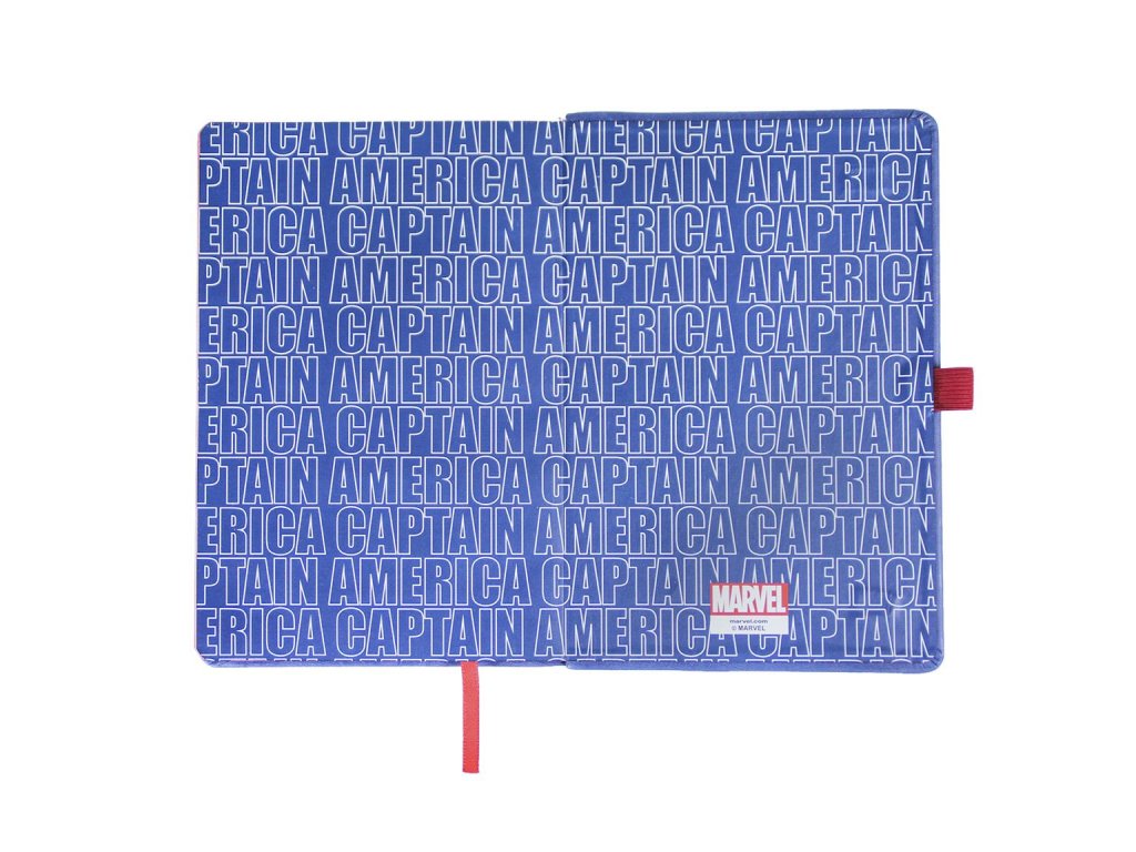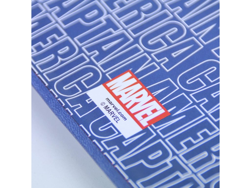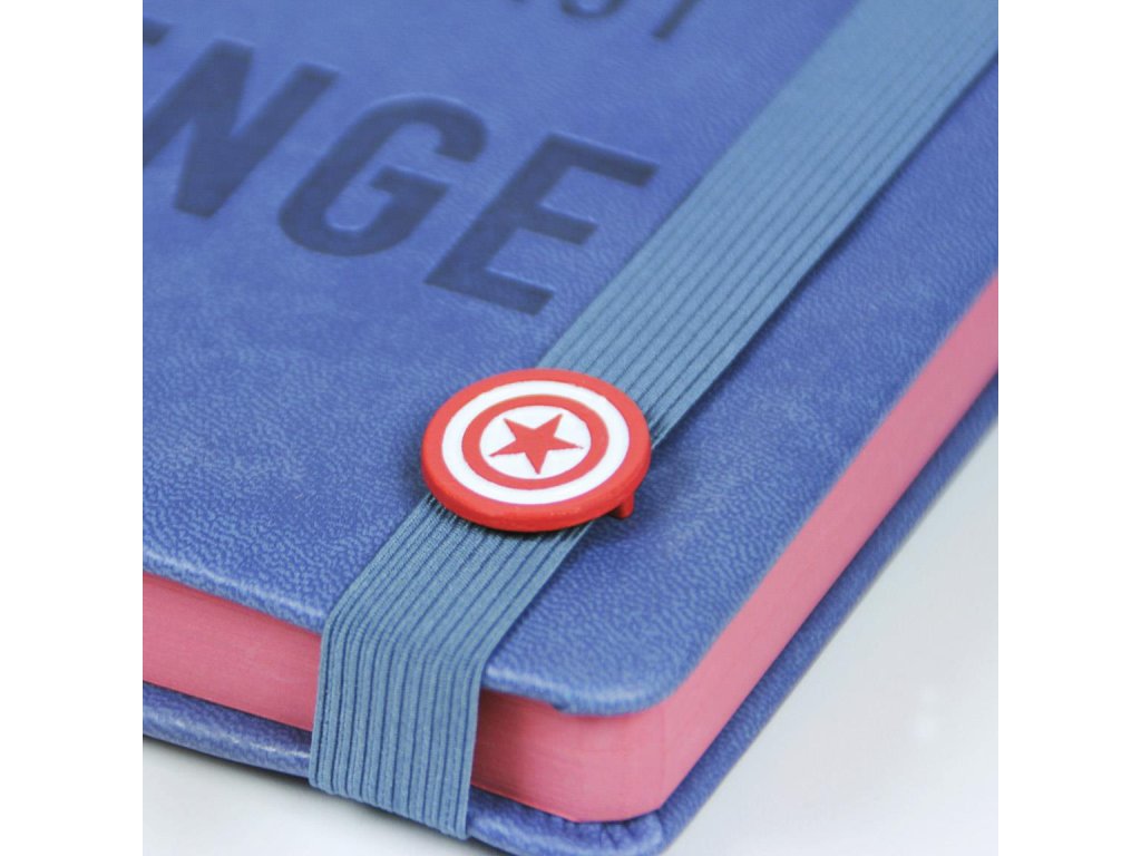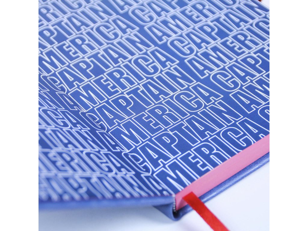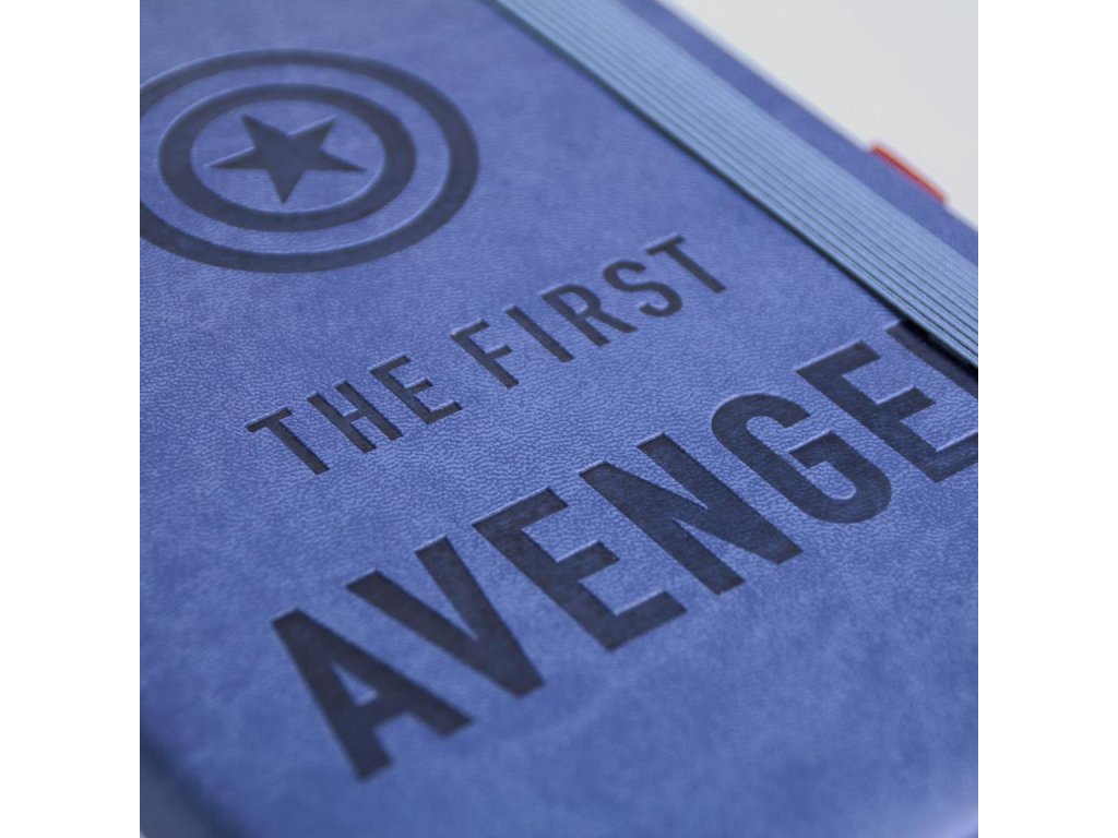 Modrý zápisník s motivem a logem Prvního Avengera - Kapitána Ameriky. Blok obsahuje také mnoho stylových detailů, které potěší každého fanouška Marvelu.