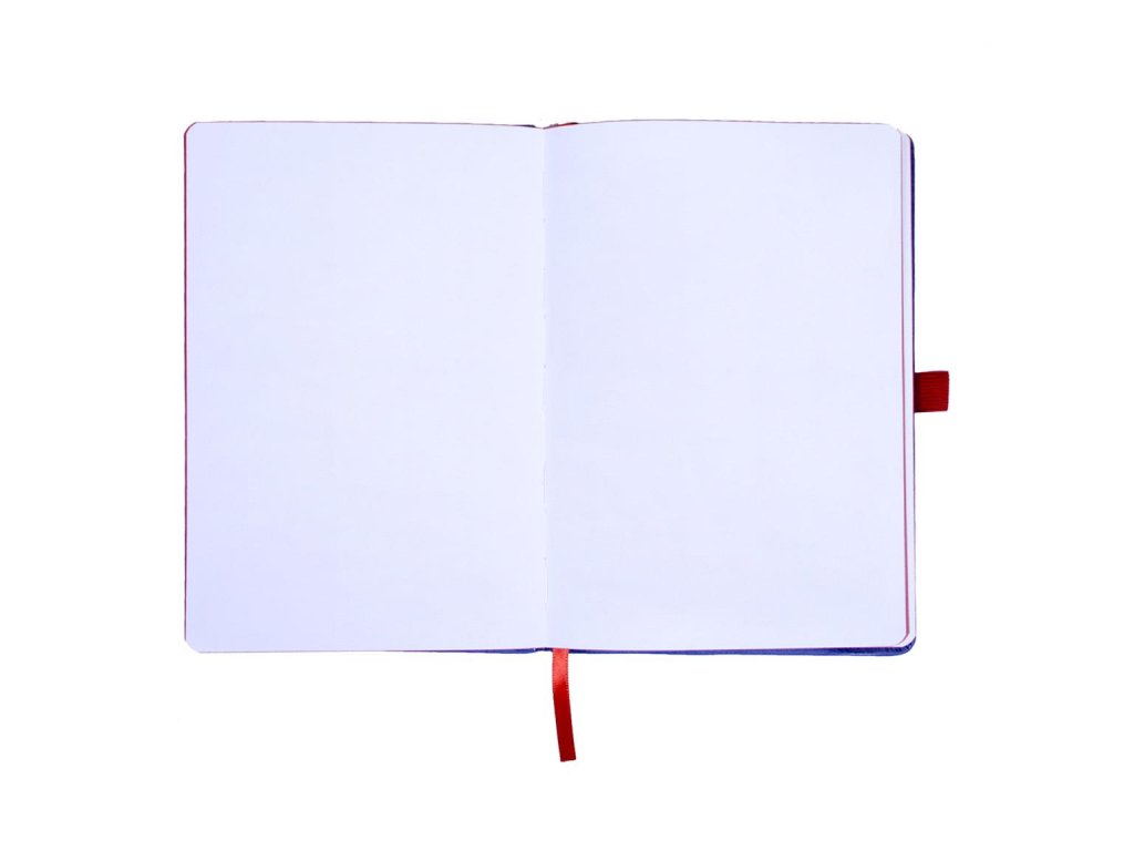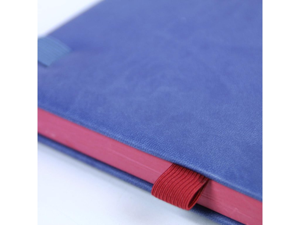 Nelinkovaný blok ve formátu A5 s lepenou vazbou, tvrdými deskami, gumičkou a záložkou.