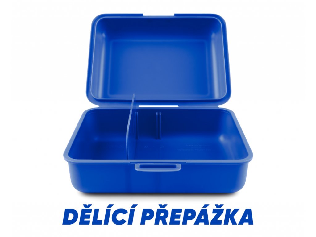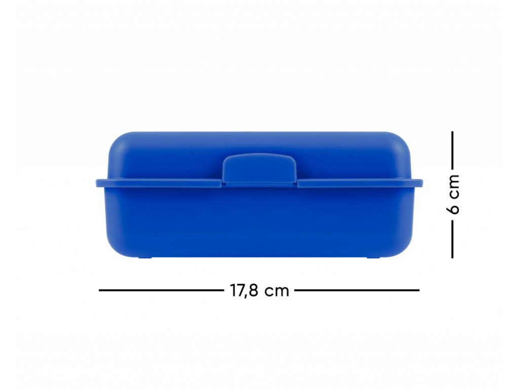 Modrý chlapecký plastový box na svačinu s uzavíráním na jeden zámek a dělící přepážkou.