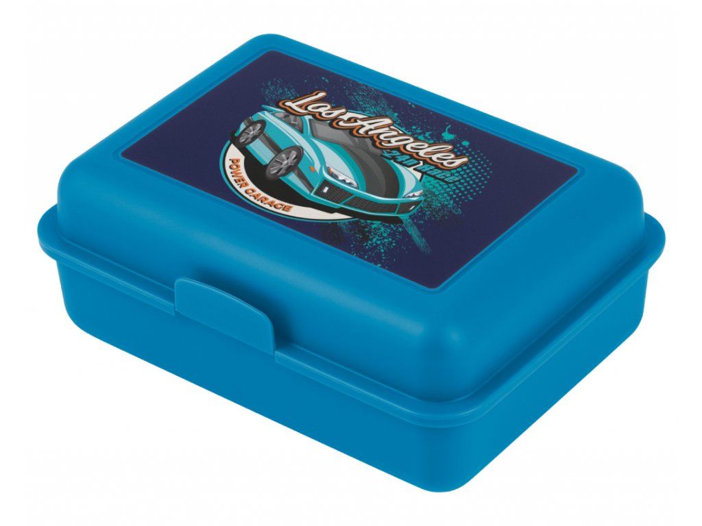 Plastový box na svačinu v modré barvě s obrázkem závodního auta.