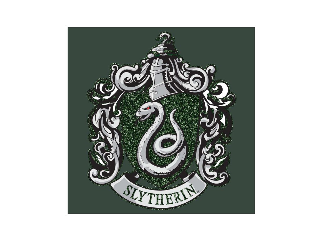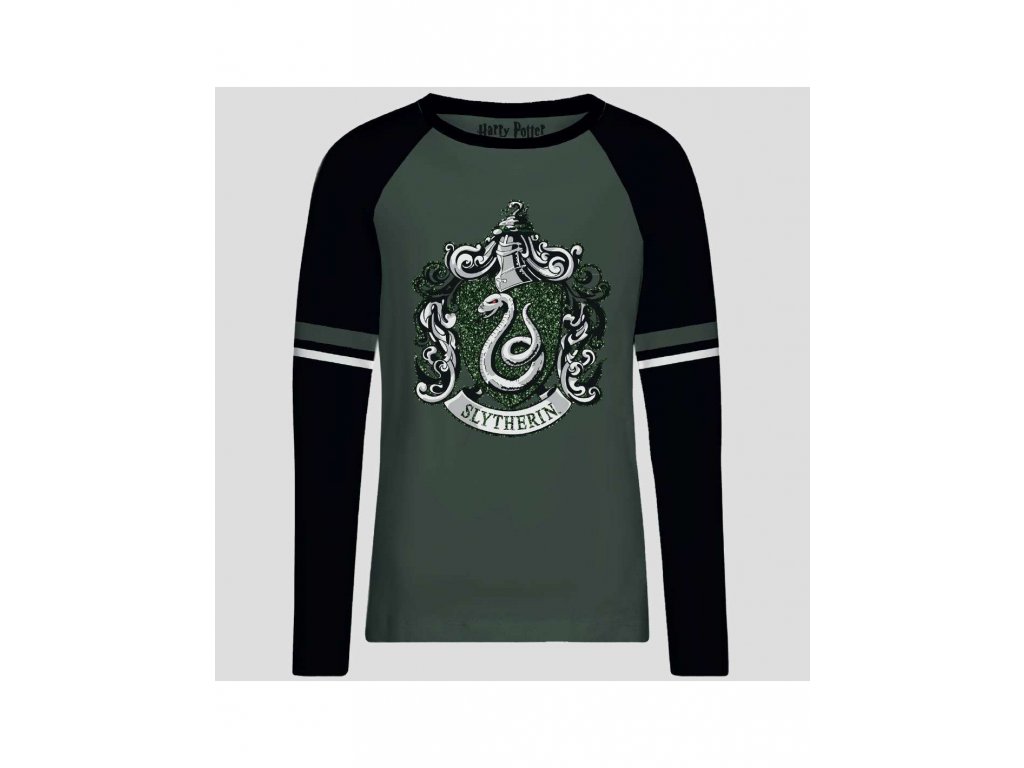 Zelené bavlněné tričko s dlouhým černým rukávem a velkým třpytivým erbem koleje Zmijozelu.