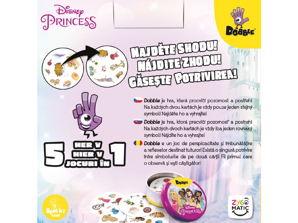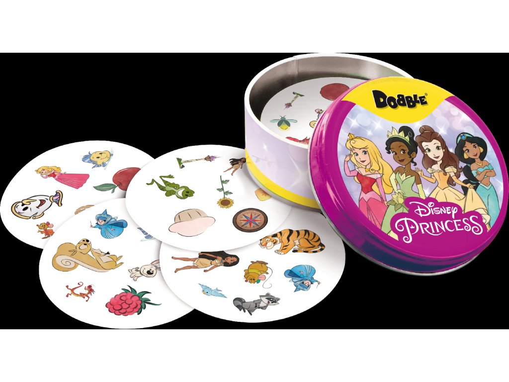Oblíbená postřehová hra Dobble na motivy Disney princezen, postaviček a charakterů.