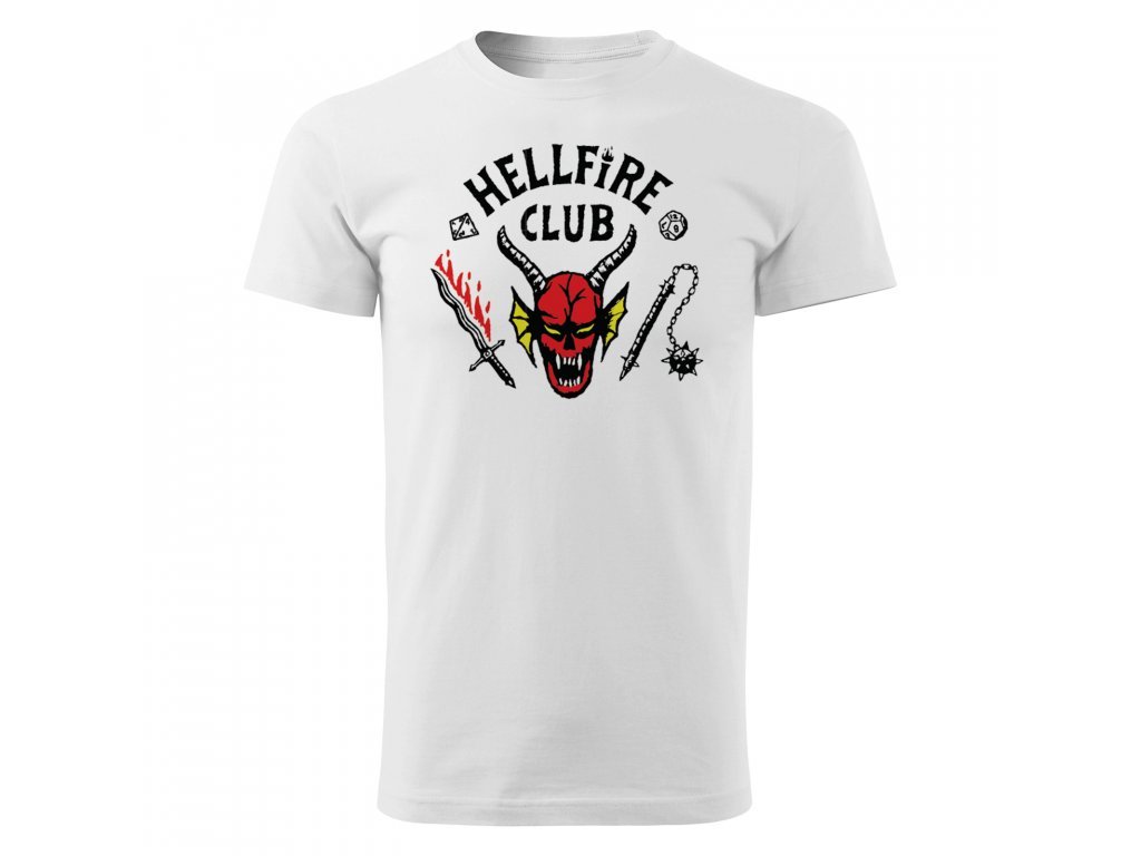Bílé bavlněné tričko s motivem loga Hellfire Clubu ze čtvrté série jednoho z nejlepších seriálů současnosti STRANGER THINGS.