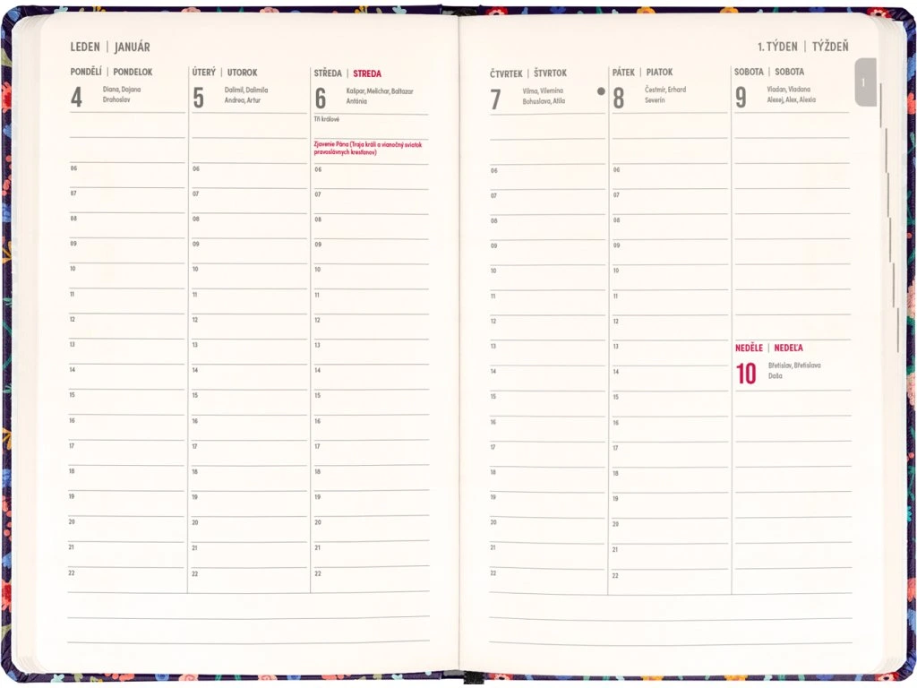 Osmnáctiměsíční diář obsahuje přehled na rok 2026 a 2027, seznam českých a slovenských jmen a česko-slovenské týdenní sloupcové kalendárium se jmény a svátky. Kalendárium začíná v červenci 2026 a končí v prosinci 2027....