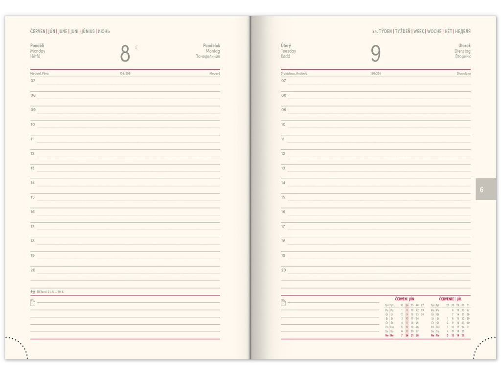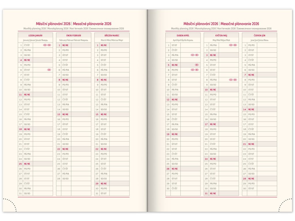 Nová řada diářů s výrazným letopočtem. Povrch má jemnou strukturu a je vhodný pro všechny typy ražeb. Denní rozložení s česko-slovenským kalendáriem a doplňkovou angličtinou, němčinou, maďarštinou a ruštinou.