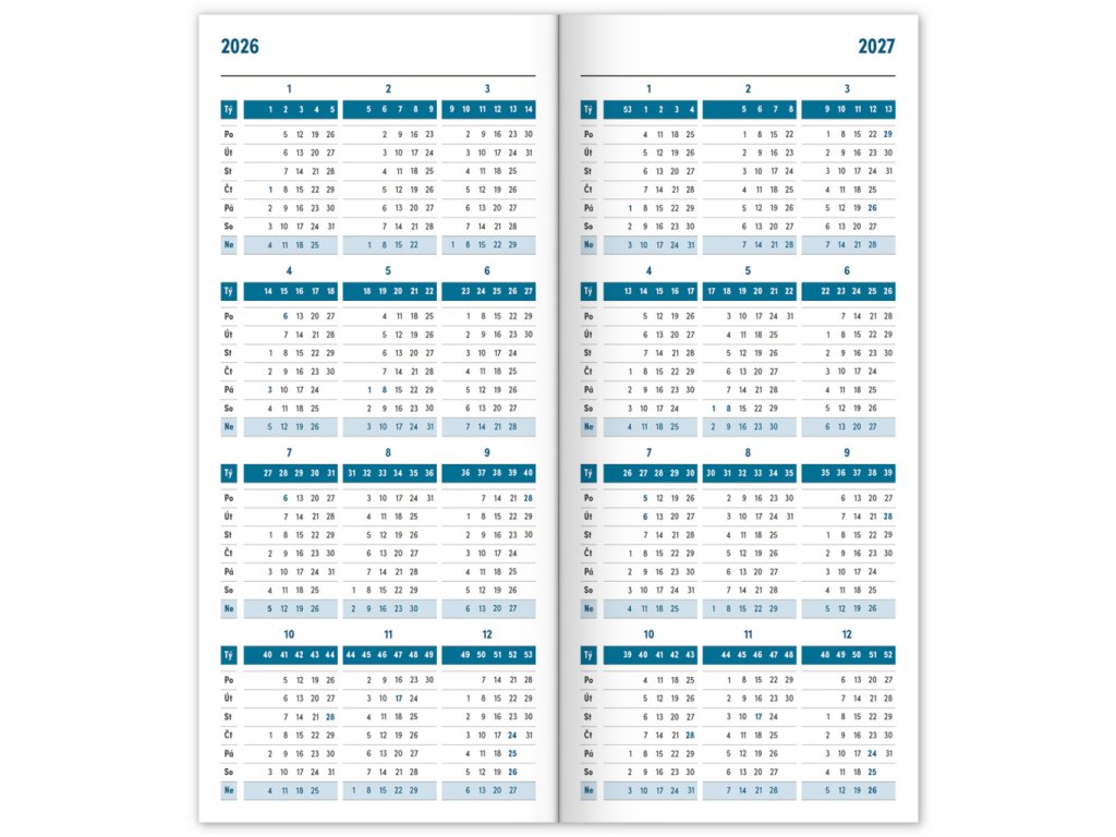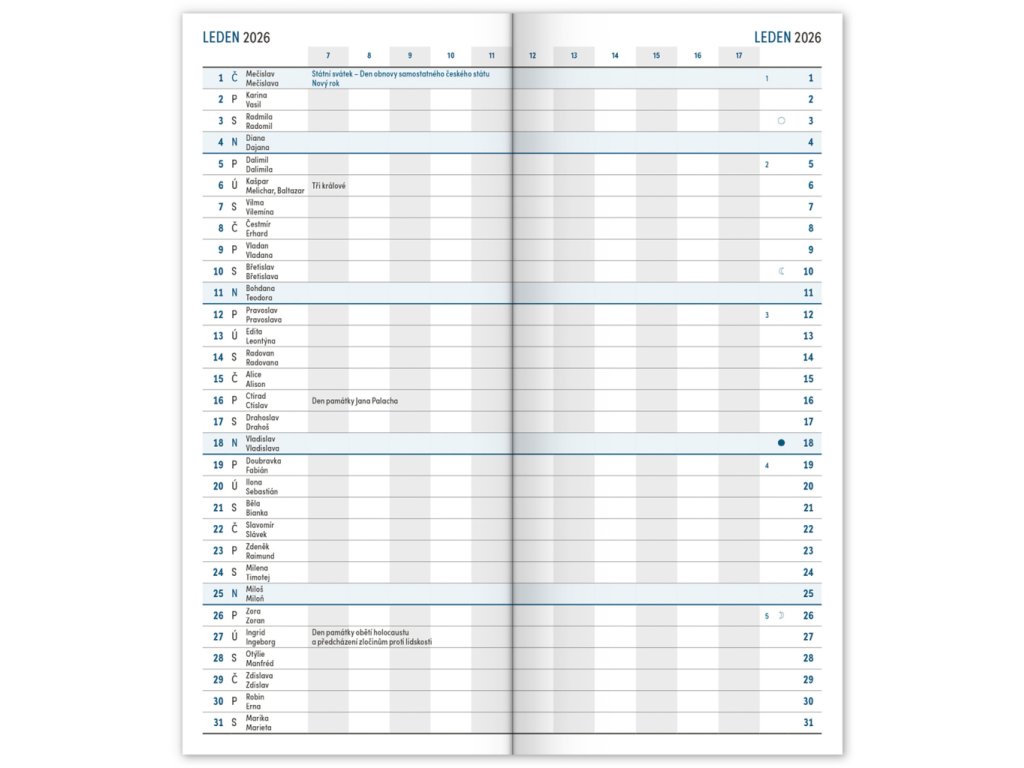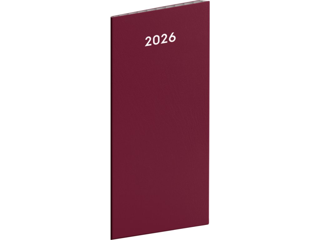 Praktický tenký diář ve vínové barvě s měsíčním rozložením se vejde opravdu všude. Obsahuje české kalendárium se jmény, svátky a památnými dny, pracovní kalendář, seznam jmen a přehled na rok 2026 a 2027.
