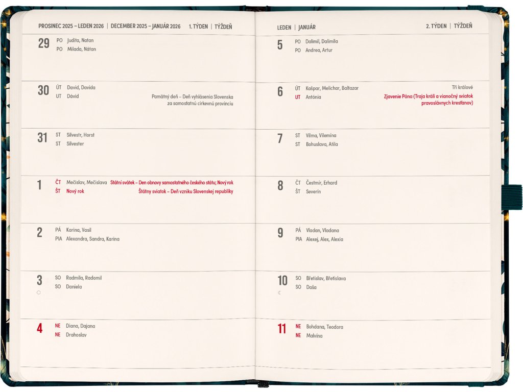 DVA SVĚTY. JEDEN PRODUKT. Hledáte dokonalou kombinaci plánování a zapisování poznámek? PLANBOOK vám přináší to nejlepší z obou světů! Perfektní spojení diáře a zápisníku – první polovina obsahuje čtrnáctidenní horizontální kalendárium s českými a slovenskými svátky, zatímco druhá polovina nabízí linkované stránky pro vaše poznámky. Praktický, stylový a dokonale přizpůsobený vašim potřebám – ať už si plánujete den, nebo přemýšlíte nad dalším velkým projektem. PLANBOOK je ideální pro všechny, kteří milují organizaci a kreativitu na jednom místě.