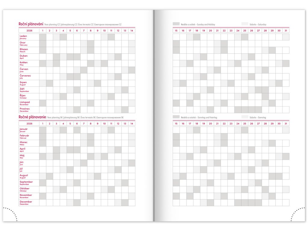 Plánovací týdenní diář Balakon 2026 v provedení bordó, doplněný o stříbrný letopočet. Povrch diáře si získal oblibu díky kvalitnímu svrchnímu materiálu, který je extrémně odolný vůči vnějšímu poškození. Týdenní rozvrh s česko-slovenským kalendáriem a doplňkovou angličtinou, němčinou, maďarštinou a ruštinou.