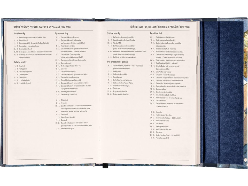 Týdenní diář s praktickým magnetickým uzavíráním je ideální volbou pro ty, kteří chtějí mít své plány přehledně pod kontrolou. Horizontální rozložení s českým a slovenským kalendáriem ve verzi týden na dvou stranách s prostorem pro poznámky. Součástí jsou praktické měsíční přehledy, ideální pro plánování dovolených či prázdnin, a také seznam českých a slovenských svátků a jmenin.