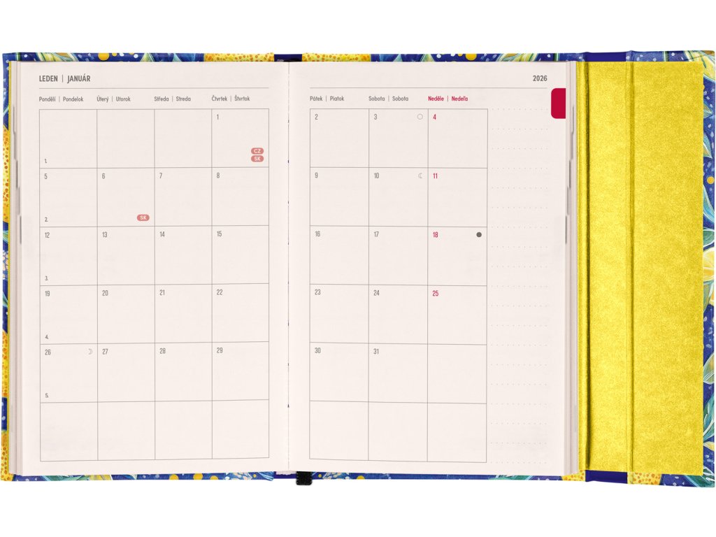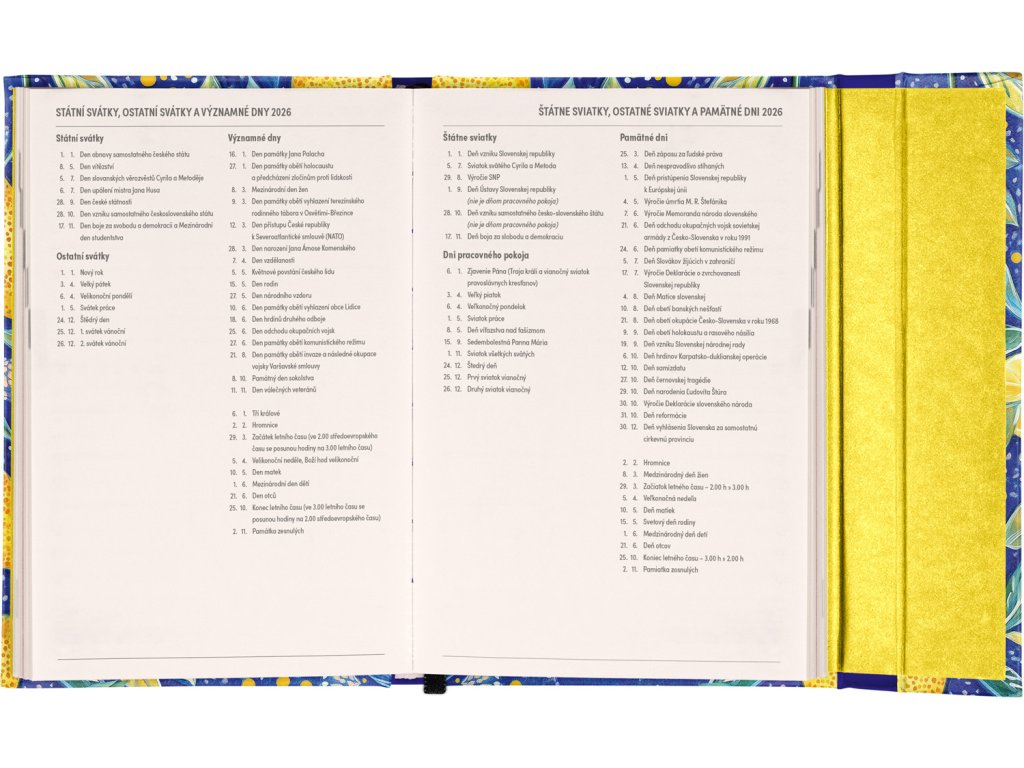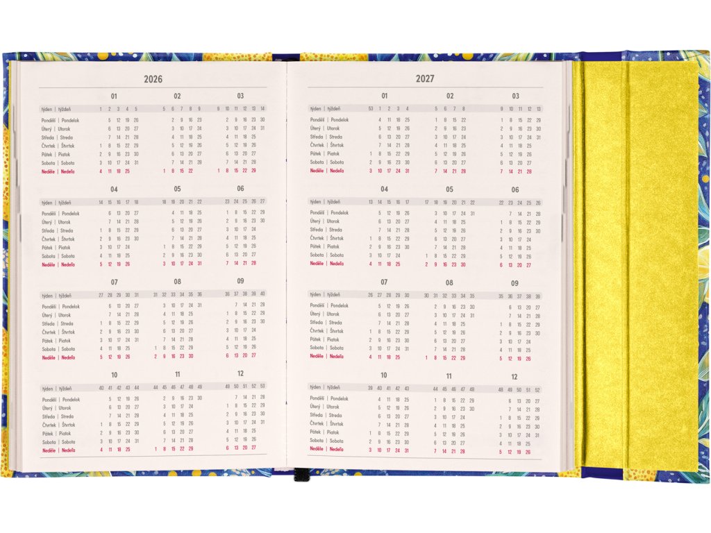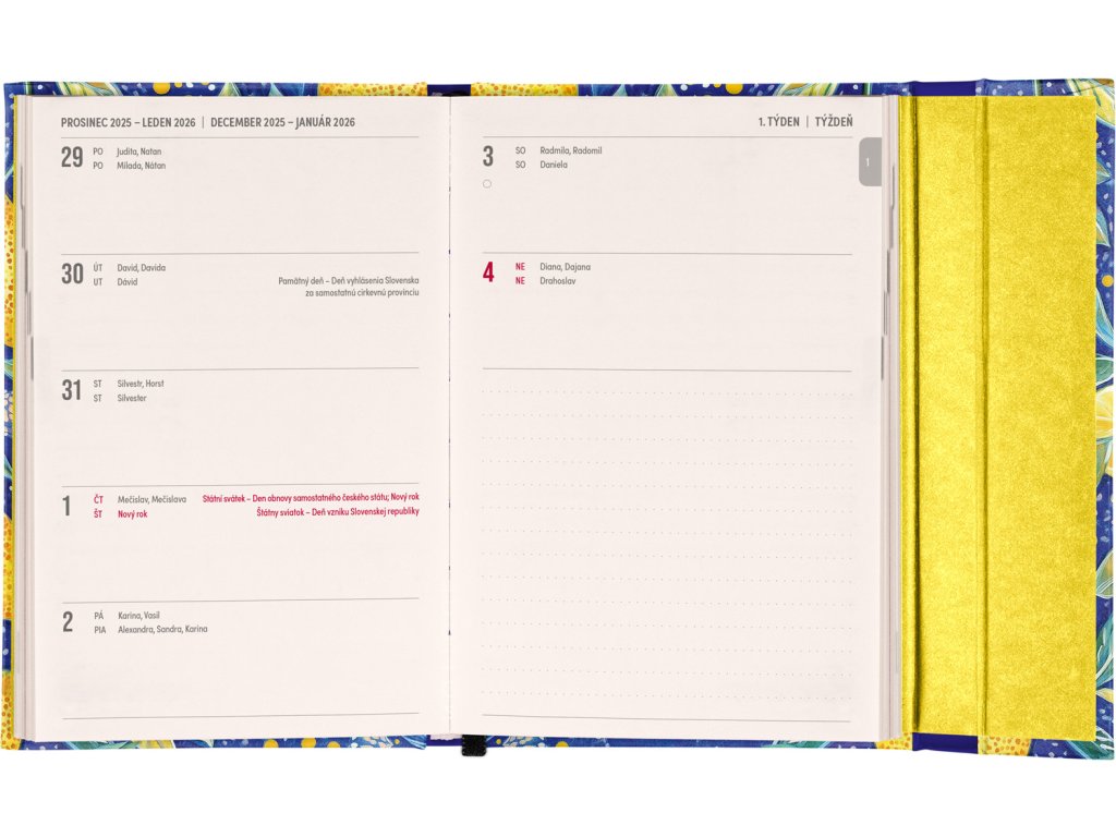 Týdenní diář s praktickým magnetickým uzavíráním je ideální volbou pro ty, kteří chtějí mít své plány přehledně pod kontrolou. Horizontální rozložení s českým a slovenským kalendáriem ve verzi týden na dvou stranách s prostorem pro poznámky. Součástí jsou praktické měsíční přehledy, ideální pro plánování dovolených či prázdnin, a také seznam českých a slovenských svátků a jmenin.