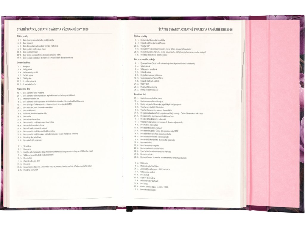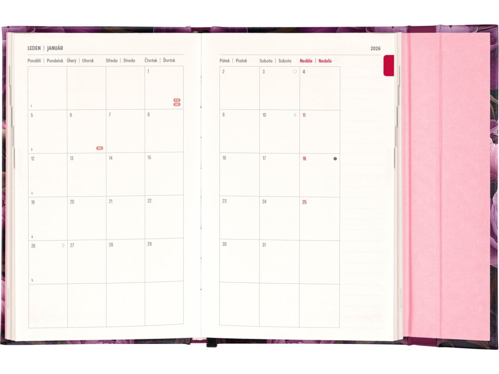 Týdenní diář s praktickým magnetickým uzavíráním je ideální volbou pro ty, kteří chtějí mít své plány přehledně pod kontrolou. Nabízí sloupcové rozvržení jednotlivých týdnů s dostatkem prostoru pro každodenní poznámky. Součástí jsou praktické měsíční přehledy, ideální pro plánování dovolených či prázdnin, a také seznam českých a slovenských svátků a jmenin.