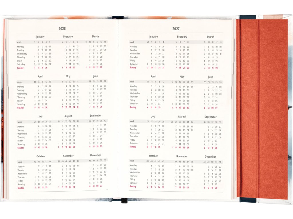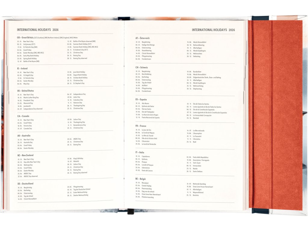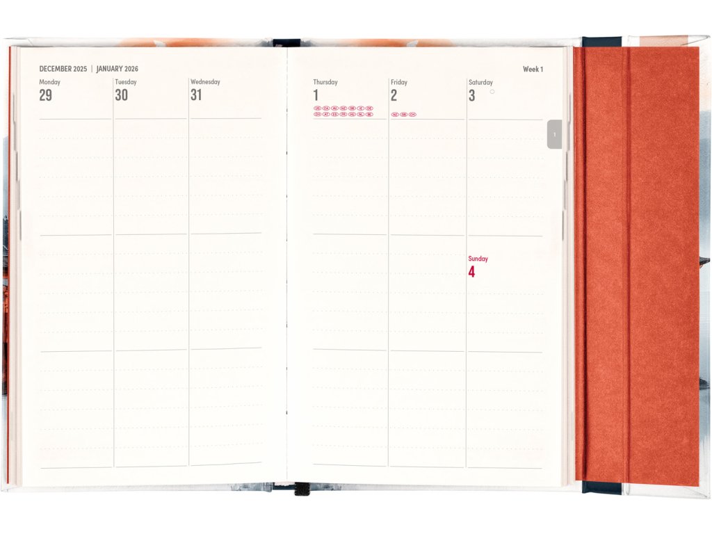 Týdenní diář v anglickém jazyce s mezinárodními svátky a praktickým magnetickým uzavíráním je ideální volbou pro ty, kteří chtějí mít své plány přehledně pod kontrolou. Nabízí sloupcové rozvržení jednotlivých týdnů s dostatkem prostoru pro každodenní poznámky. Součástí jsou praktické měsíční přehledy, ideální pro plánování dovolených či prázdnin.