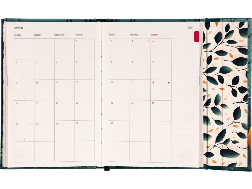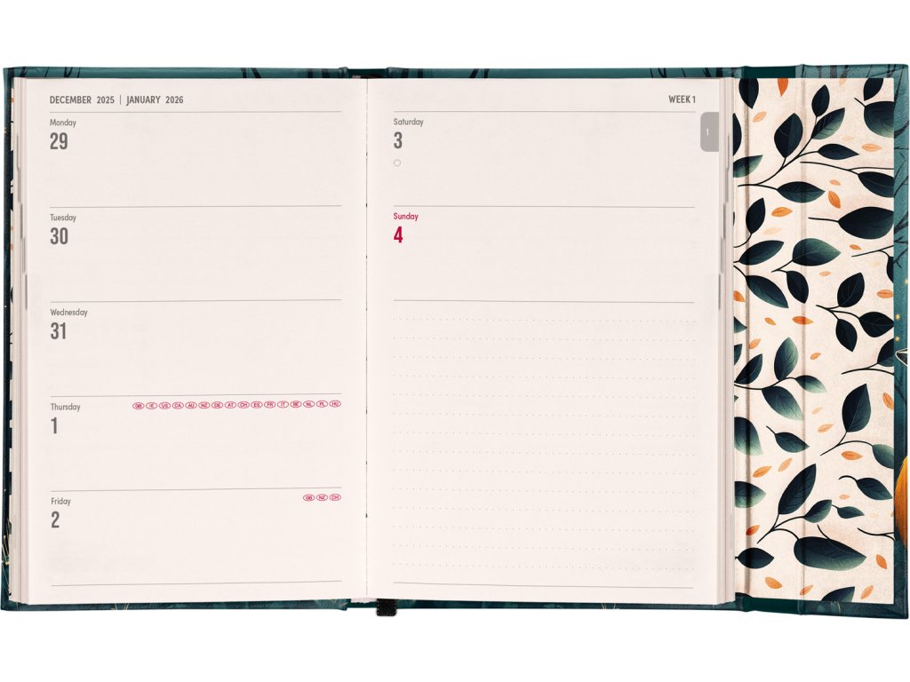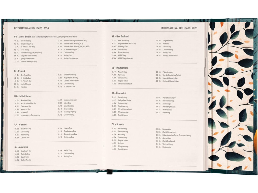 Týdenní diář v anglickém jazyce s mezinárodními svátky a praktickým magnetickým uzavíráním je ideální volbou pro ty, kteří chtějí mít své plány přehledně pod kontrolou. Nabízí horizontální rozložení ve verzi týden na dvou stranách s prostorem pro poznámky. Součástí jsou praktické měsíční přehledy, ideální pro plánování dovolených či prázdnin.