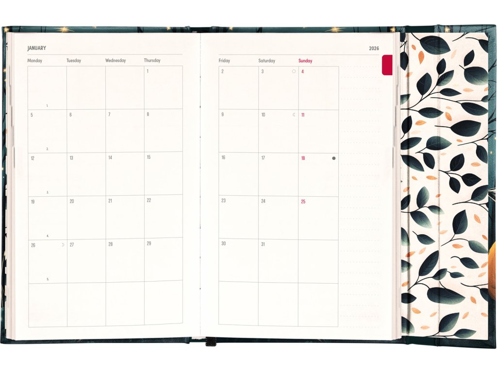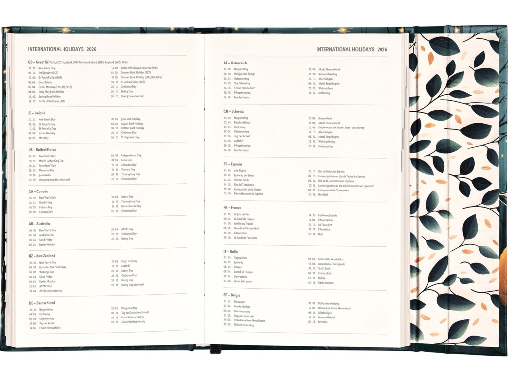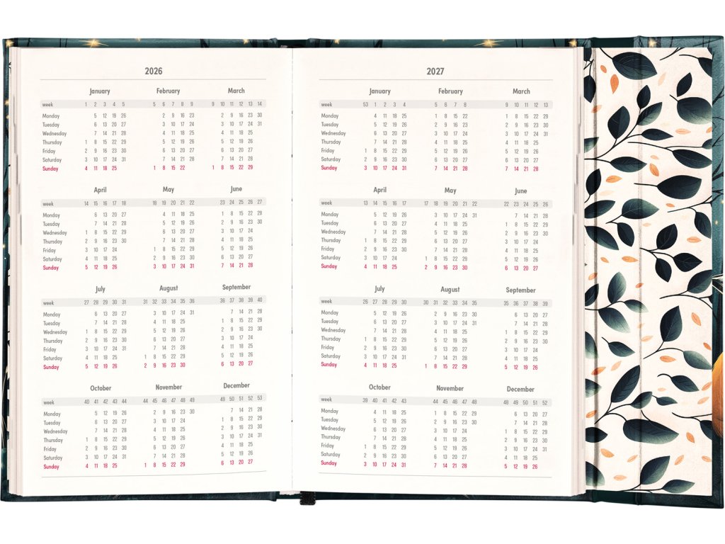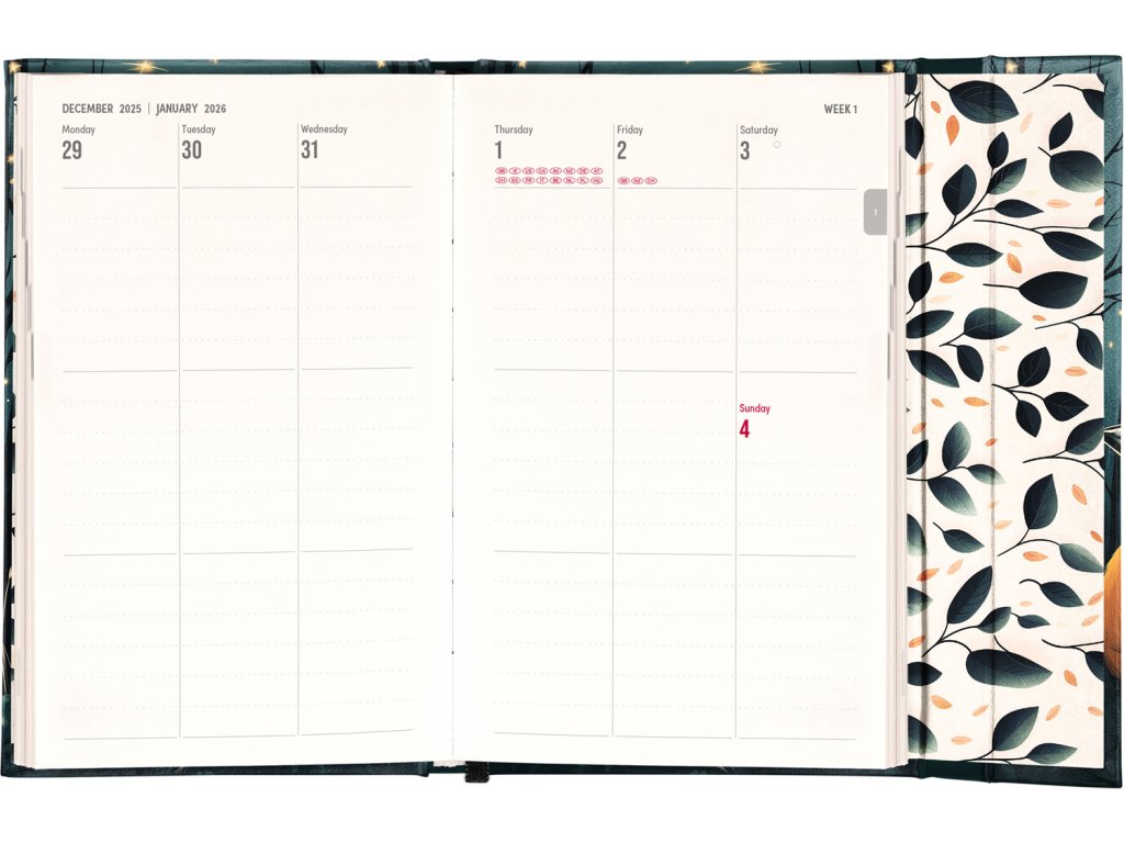 Týdenní diář v anglickém jazyce s mezinárodními svátky a praktickým magnetickým uzavíráním je ideální volbou pro ty, kteří chtějí mít své plány přehledně pod kontrolou. Nabízí sloupcové rozvržení jednotlivých týdnů s dostatkem prostoru pro každodenní poznámky. Součástí jsou praktické měsíční přehledy, ideální pro plánování dovolených či prázdnin.
