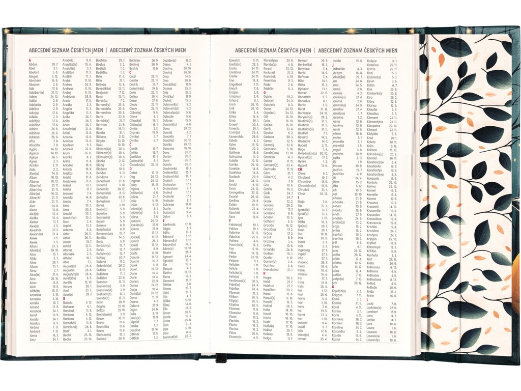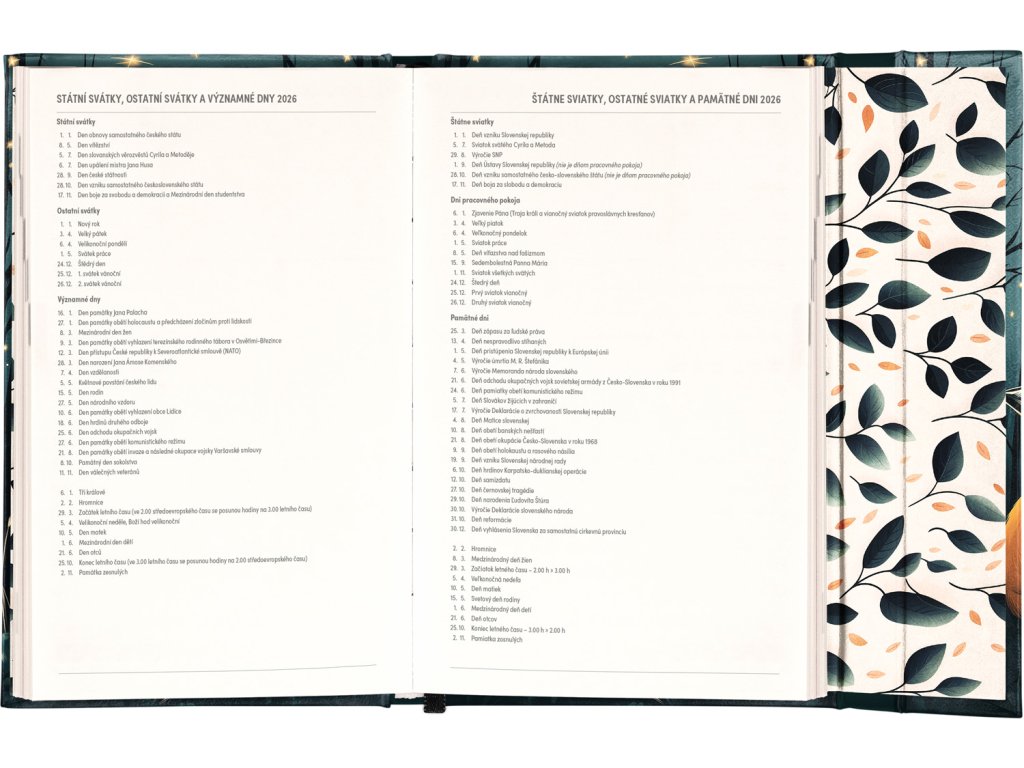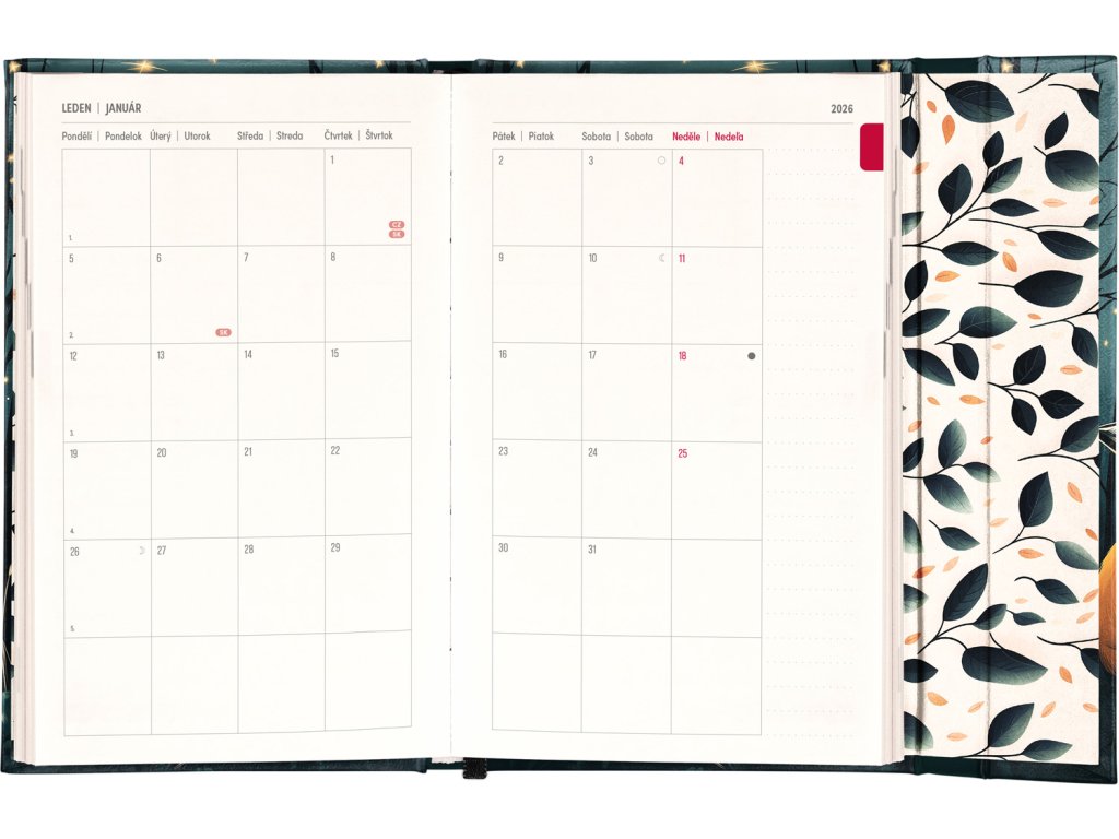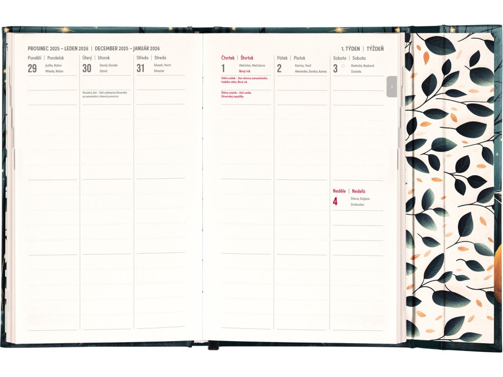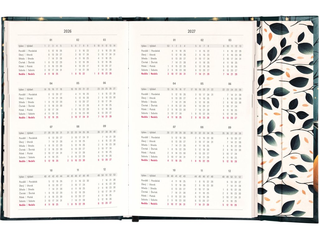 Týdenní diář s praktickým magnetickým uzavíráním je ideální volbou pro ty, kteří chtějí mít své plány přehledně pod kontrolou. Nabízí sloupcové rozvržení jednotlivých týdnů s dostatkem prostoru pro každodenní poznámky. Součástí jsou praktické měsíční přehledy, ideální pro plánování dovolených či prázdnin, a také seznam českých a slovenských svátků a jmenin.