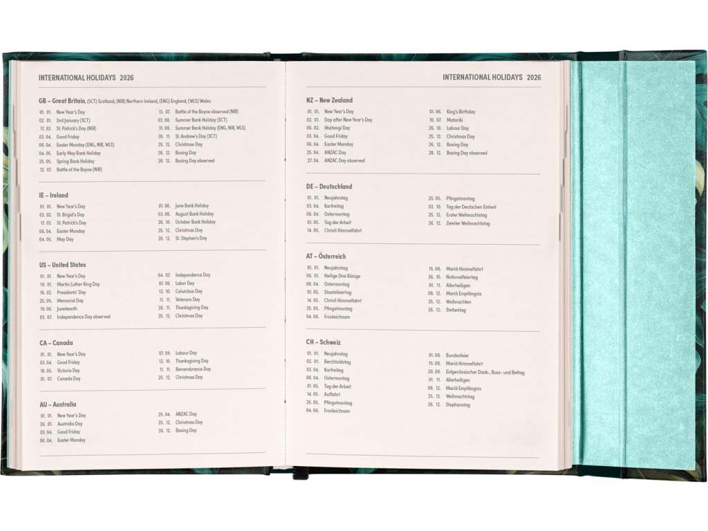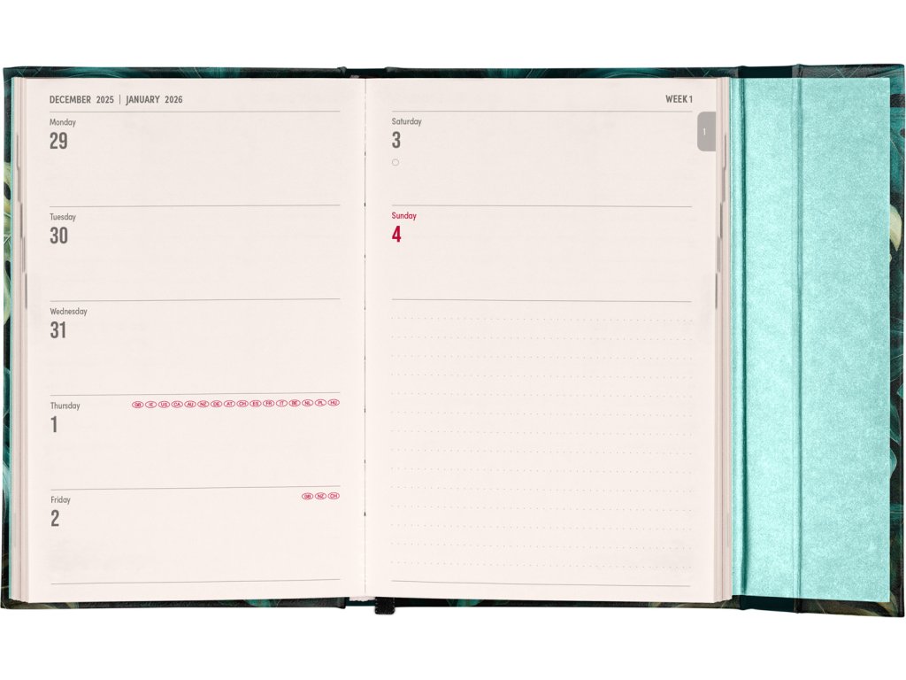Týdenní diář v anglickém jazyce s mezinárodními svátky a praktickým magnetickým uzavíráním je ideální volbou pro ty, kteří chtějí mít své plány přehledně pod kontrolou. Nabízí horizontální rozložení ve verzi týden na dvou stranách s prostorem pro poznámky. Součástí jsou praktické měsíční přehledy, ideální pro plánování dovolených či prázdnin.