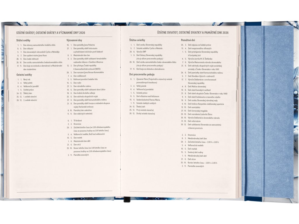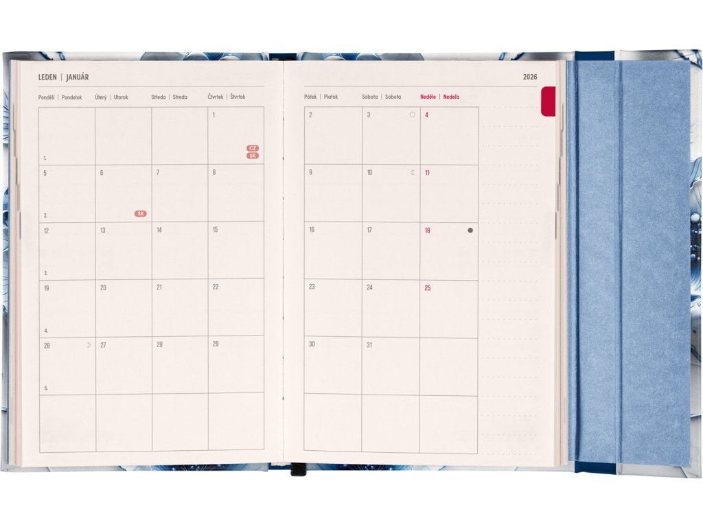 Týdenní diář s praktickým magnetickým uzavíráním je ideální volbou pro ty, kteří chtějí mít své plány přehledně pod kontrolou. Horizontální rozložení s českým a slovenským kalendáriem ve verzi týden na dvou stranách s prostorem pro poznámky. Součástí jsou praktické měsíční přehledy, ideální pro plánování dovolených či prázdnin, a také seznam českých a slovenských svátků a jmenin.