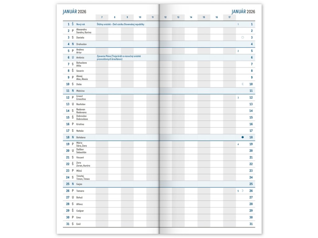 Praktický tenký diář v černé barvě s měsíčním rozložením se vejde opravdu všude. Obsahuje slovenské kalendárium se jmény, svátky a památnými dny, pracovní kalendář, seznam jmen a přehled na rok 2026 a 2027.