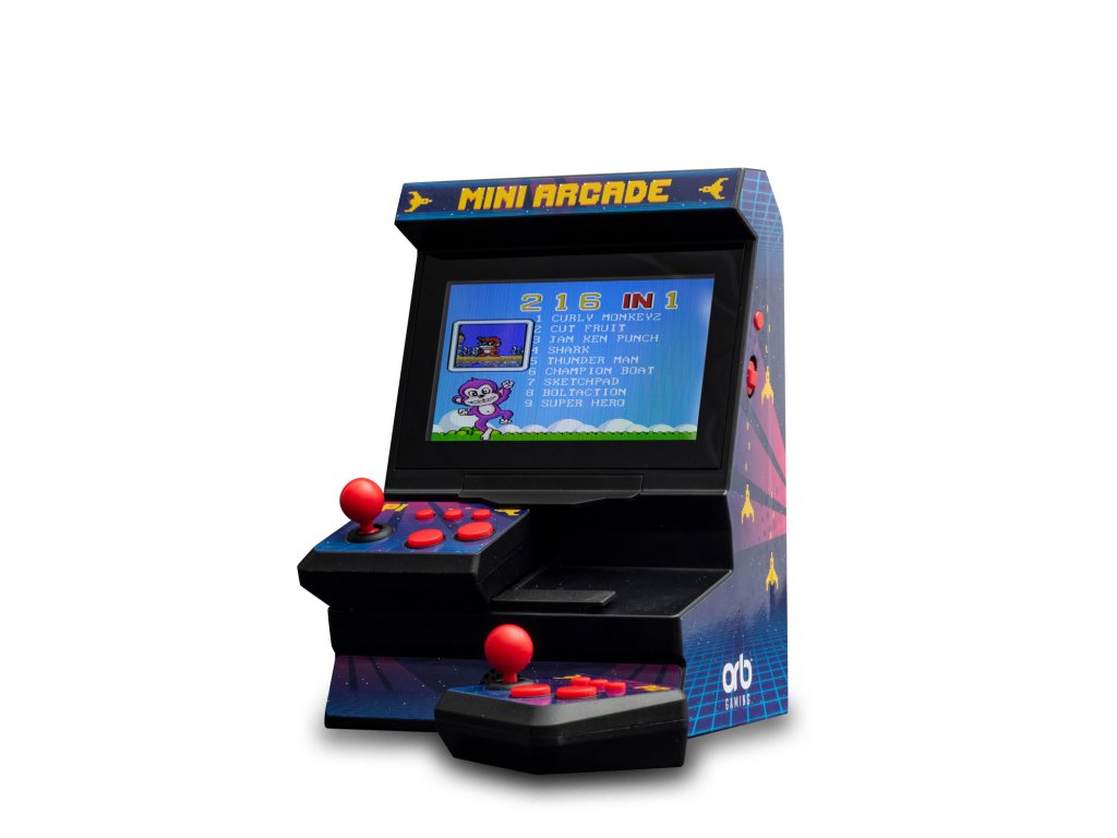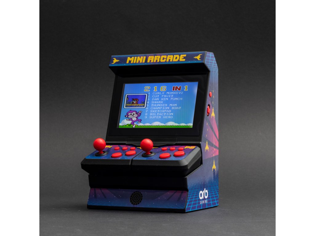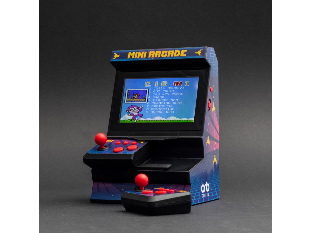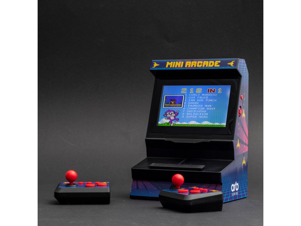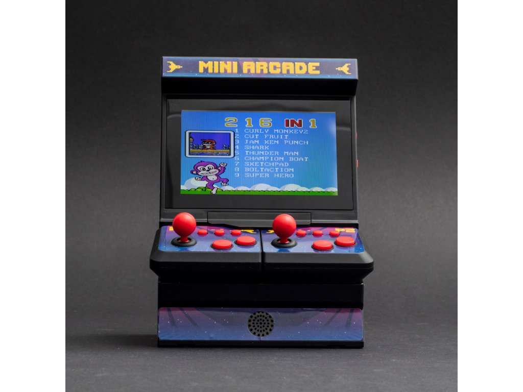 Miniaturní herní Arcade Automat - Digihra s dvěma bezdrátovými ovladači a barevným displejem. Konzole ve tvaru klasického herního automatu na které si můžete zahrát 300 klasických 8-bitových her.