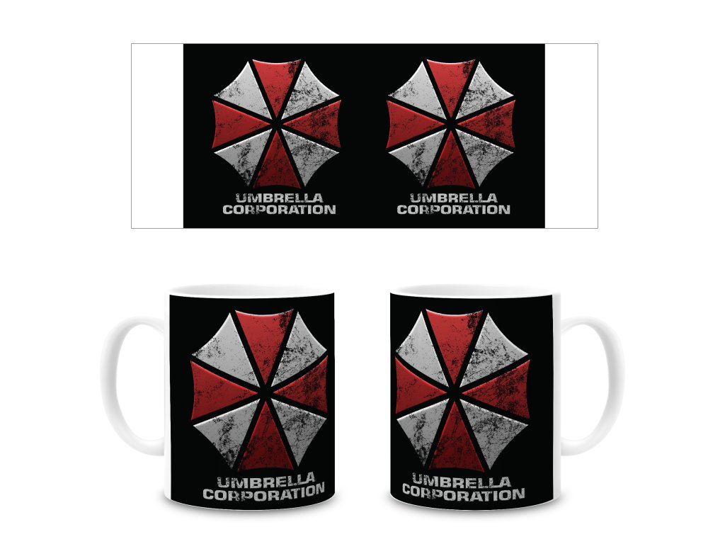 Bílý keramický hrnek s logem společnosti Umbrella odpovědné za vypuštění zombie viru.
