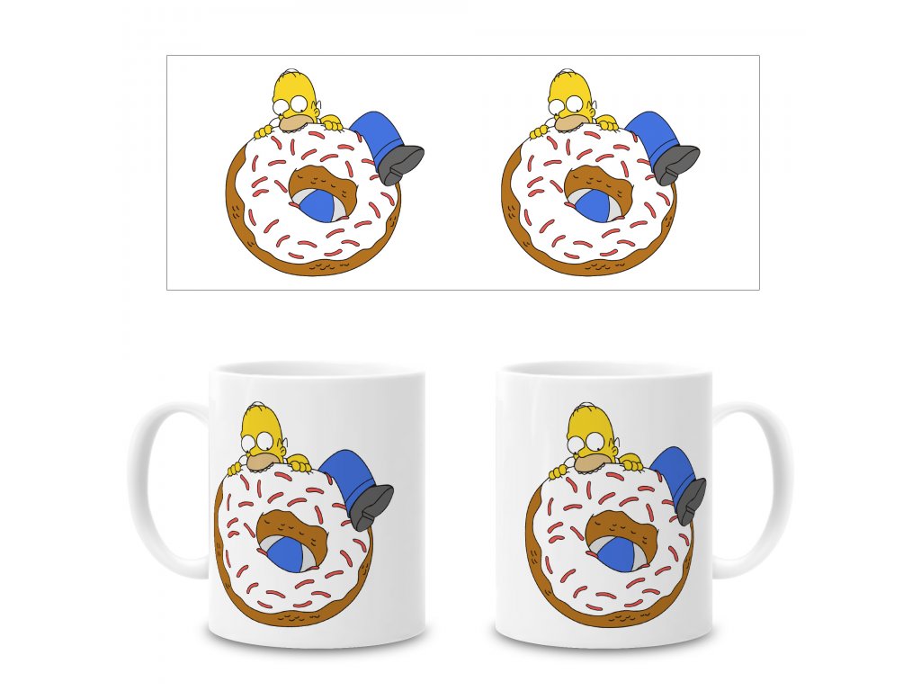 Keramický hrnek s americkým "hrdinou" Homerem Simpsonem s jeho oblíbenou pochutinou ve vysněné velikosti.