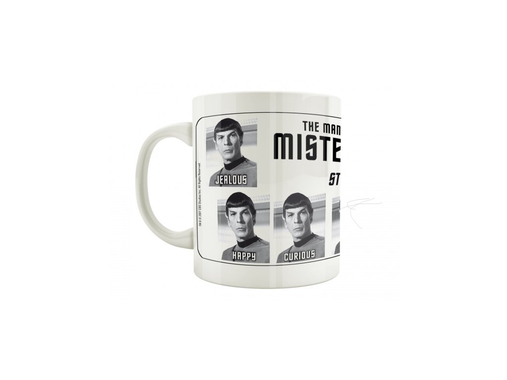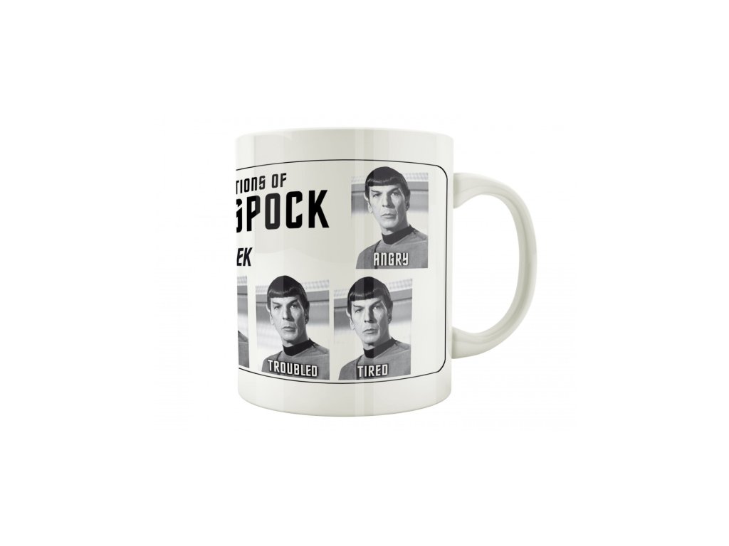 Bílý keramický hrnek se všemi typickými výrazy obličeje vulkánce Spocka v podání Leonarda Nimoe z populárního sci-fi světa Star Trek.