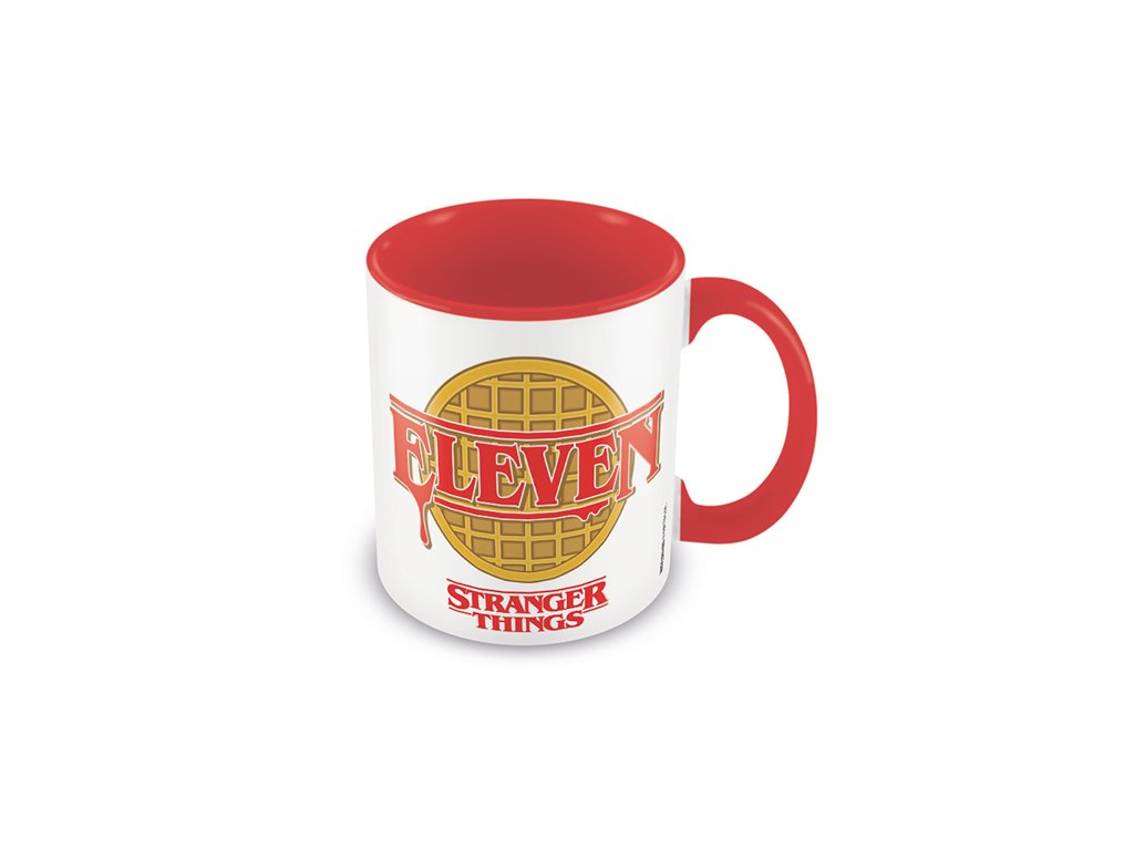 Červený keramický hrnek s bílým potiskem který přímo zve k nejoblíbenějšímu jídlu Eleven a tím jsou lívance/wafle značky Eggos.