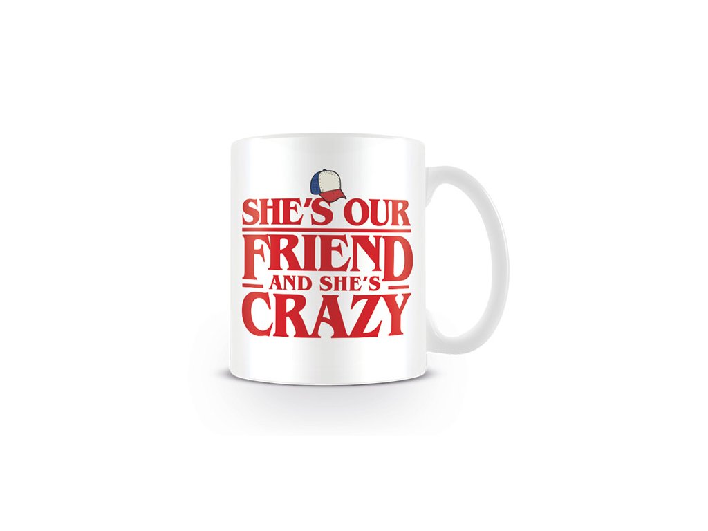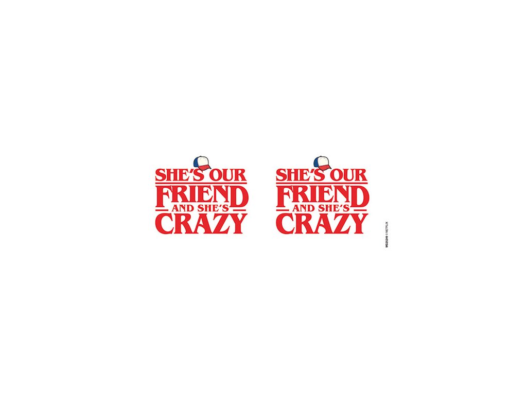Oficiální hrnek s nápisem "She´s our Friend and she´s Crazy" (Ona je náš kamarád a je šílená!) z jednoho z nejlepších seriálů současnosti STRANGER THINGS.