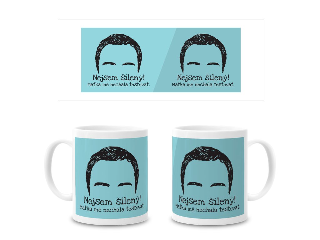 Bílý keramický hrnek nejen pro fanoušky seriálu The Big Bang Theory s nezaměnitelným motivem Sheldonovy siluety a nápisem: "Nejsem šílený. Matka mě nechala testovat."
