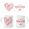 Bílý keramický hrnek pro zamilované. Místo nápisu ŠŤASTNÝ VALENTÝN, Vám můžeme doplnit jméno milovaného nebo jakýkoliv jiný krátký vzkaz. Ideální dárek nejen na svátek svatého Valentýna.