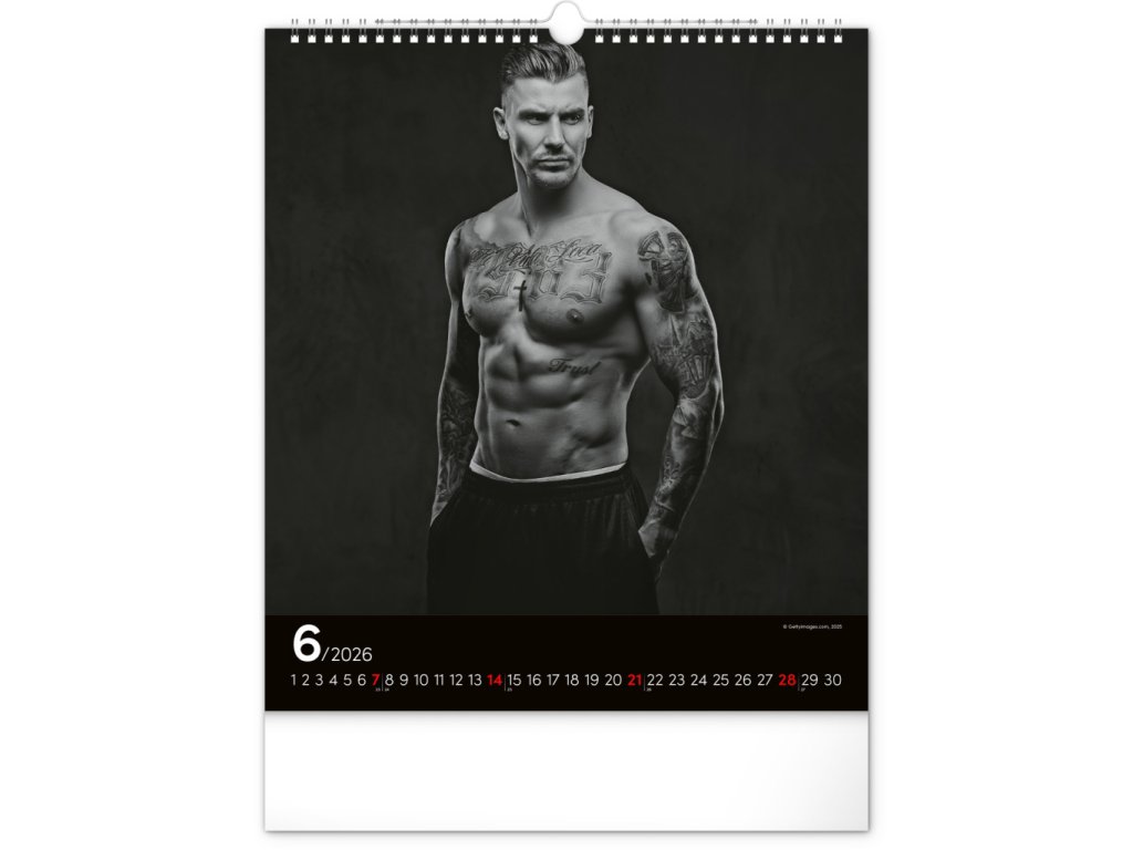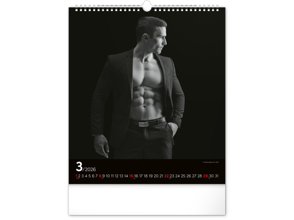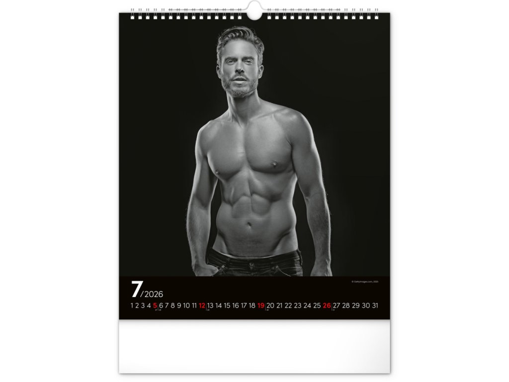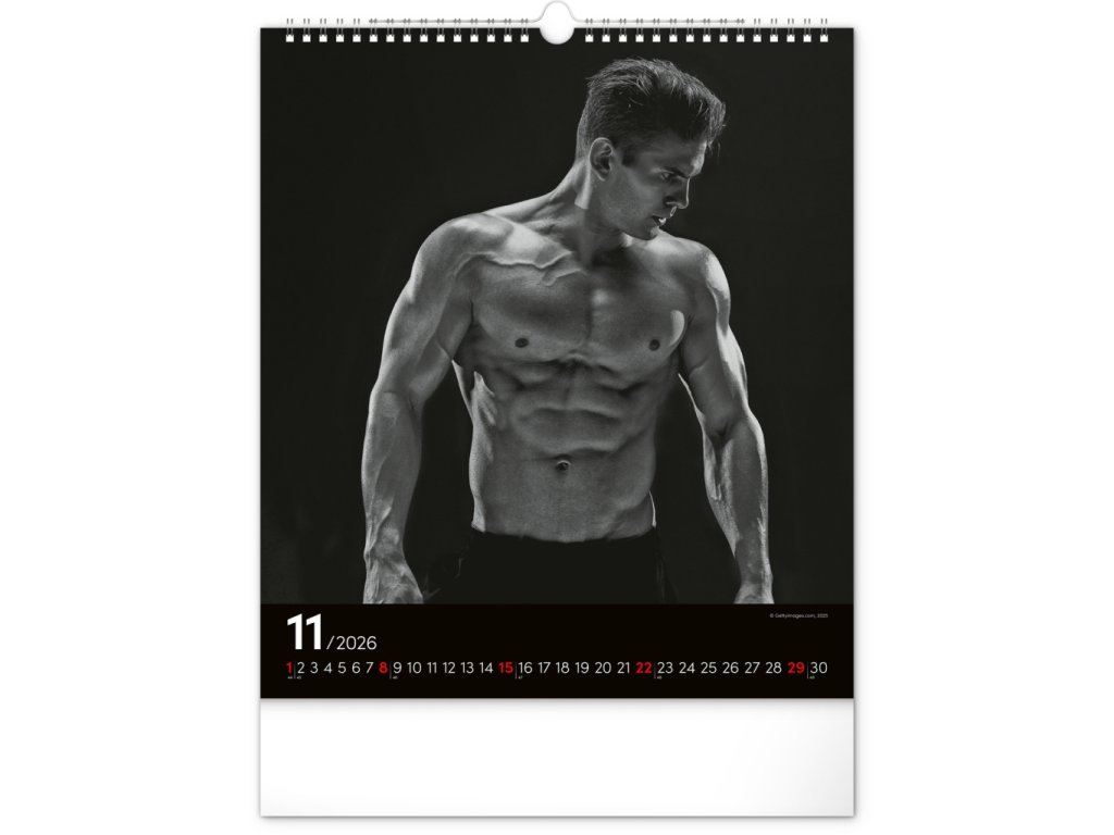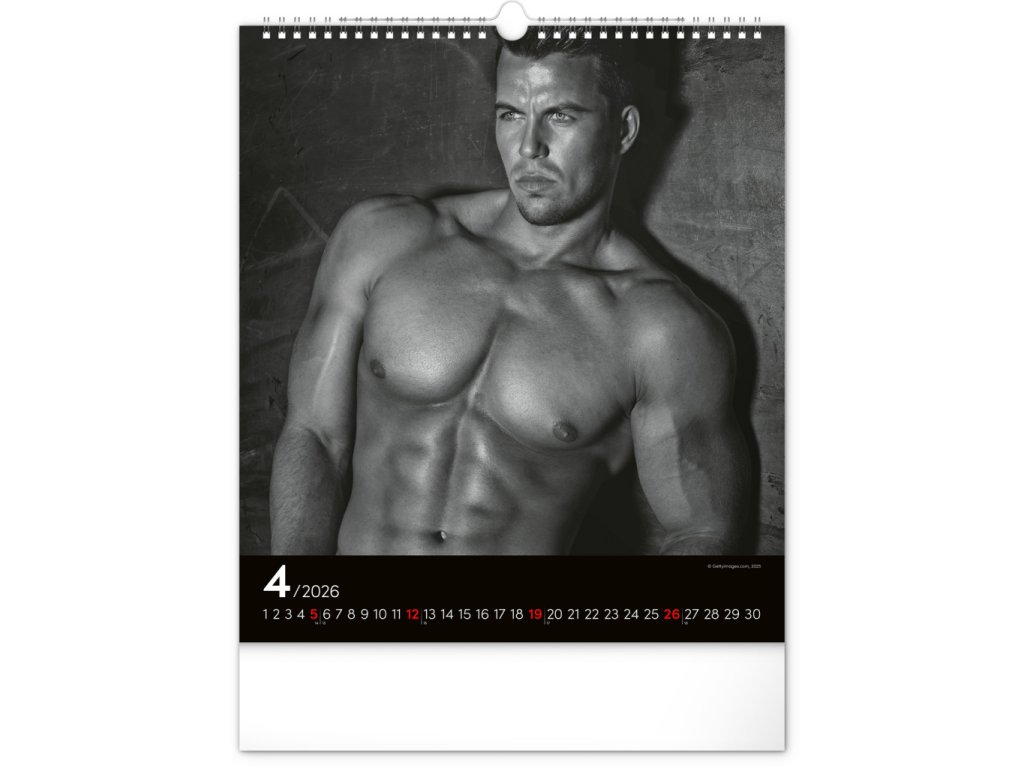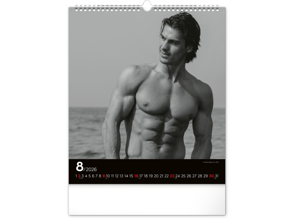 Celý rok se můžete kochat pohledem na vyrýsovaná těla přitažlivých mužů na černobílých fotografiích. Nechybí jednoduché kalendárium na černém pozadí.