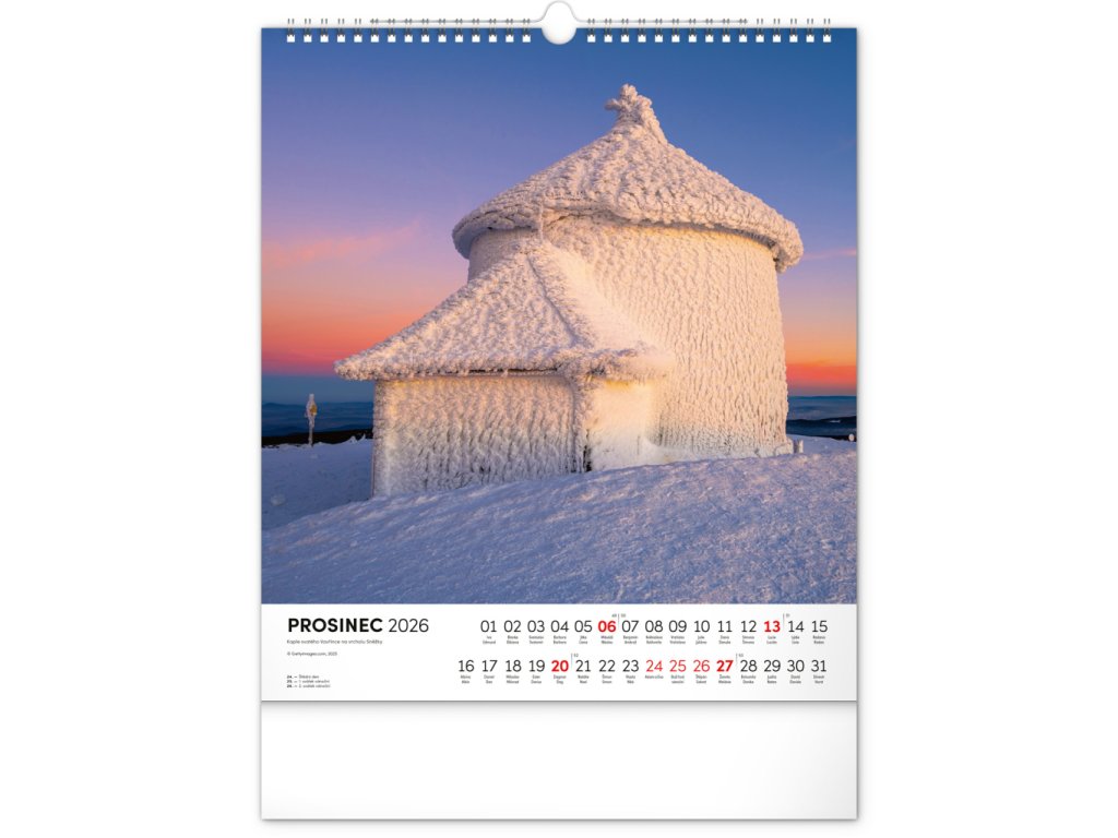 Dvanáct působivých snímků zachycujících krásu Krkonoš ve čtvercovém formátu. Fotografie jsou doplněny jednoduchým kalendáriem na bílém pozadí....