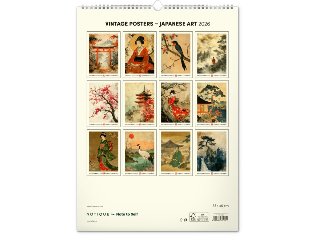 NOTIQUE Nástěnný kalendář Vintage plakáty – japonské umění 2026, 33 x 46 cm