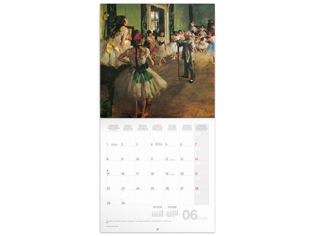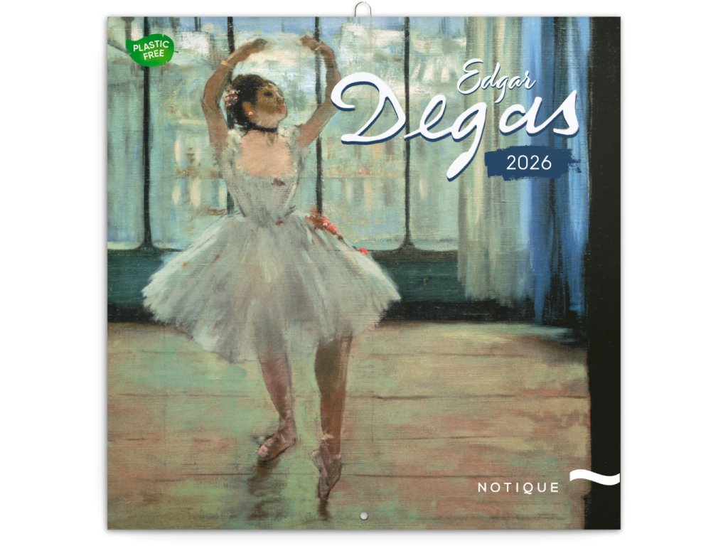 Dvanáct obrazů Edgara Degase v praktickém poznámkovém kalendáři. Kalendář obsahuje přehledné kalendárium od září 2025 do prosince 2026 v osmi jazycích, měsíční fáze, důležité svátky a prostor pro poznámky na každý den. Kalendář je součástí kolekce Plastic Free, je zabalený v obálce z recyklovaného papíru a vytištěný na recyklovaném strukturovaném papíře s vysokou gramáží.