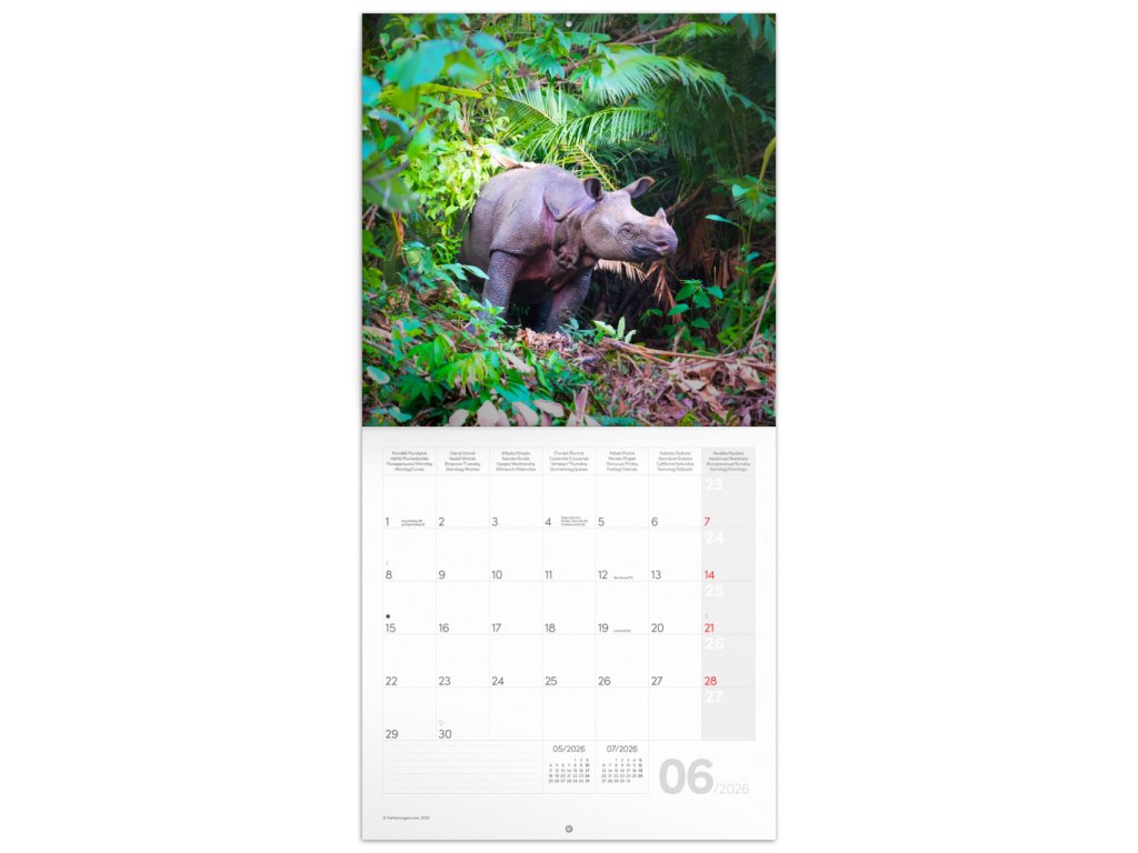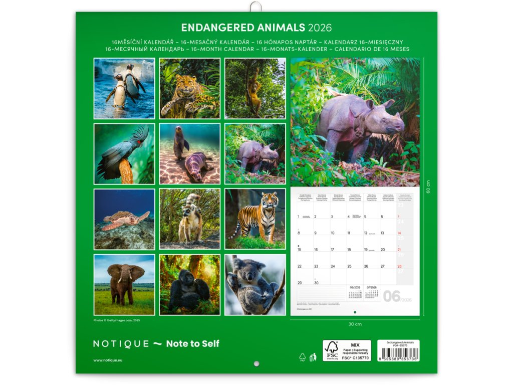 Dvanáct fotografií ohrožených zvířat v praktickém poznámkovém kalendáři. Kalendář obsahuje přehledné kalendárium od září 2025 do prosince 2026 v osmi jazycích, měsíční fáze, důležité svátky a prostor pro poznámky na každý den. Kalendář je součástí ko...
