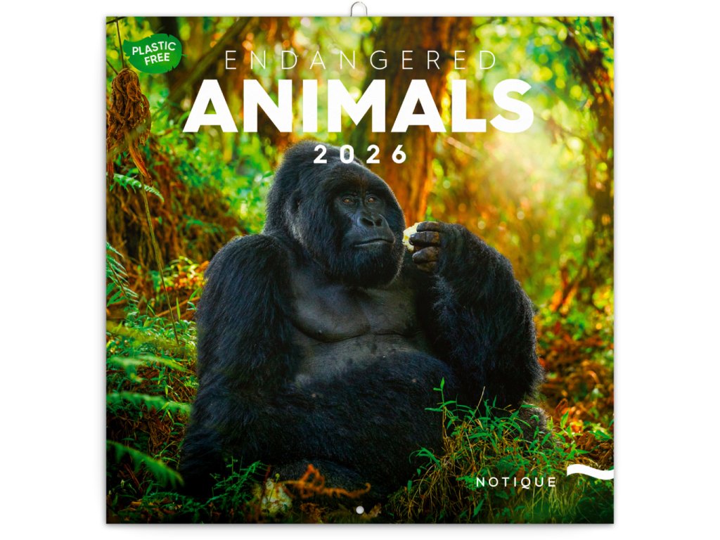 Dvanáct fotografií ohrožených zvířat v praktickém poznámkovém kalendáři. Kalendář obsahuje přehledné kalendárium od září 2025 do prosince 2026 v osmi jazycích, měsíční fáze, důležité svátky a prostor pro poznámky na každý den. Kalendář je součástí kolekce Plastic Free, je zabalený v obálce z recyklovaného papíru a vytištěný na recyklovaném strukturovaném papíře s vysokou gramáží.