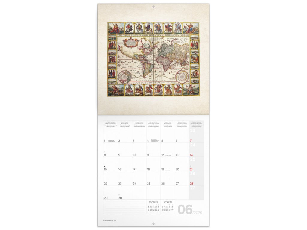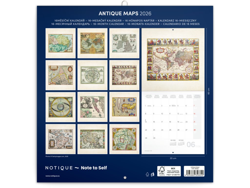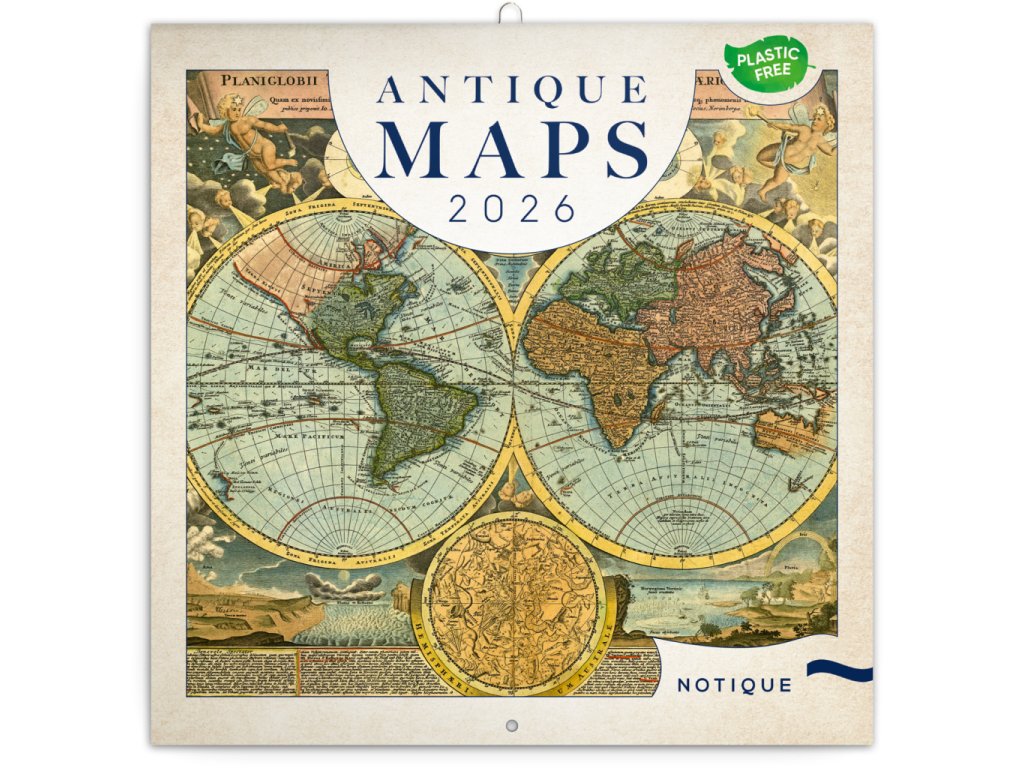 Dvanáct ilustrací starých map v praktickém poznámkovém kalendáři. Kalendář obsahuje přehledné kalendárium od září 2025 do prosince 2026 v osmi jazycích, měsíční fáze, důležité svátky a prostor pro poznámky na každý den. Kalendář je součástí kolekce Plastic Free, je zabalený v obálce z recyklovaného papíru a vytištěný na recyklovaném strukturovaném papíře s vysokou gramáží.