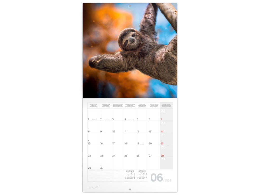 Fotografie roztomilých prasátek, opiček nebo lachtanů vám budou dělat radost celý rok. V kalendáři kromě fotek najdete přehledné kalendárium od září 2025 do prosince 2026 v šesti jazycích, měsíční fáze, důležité svátky a prostor pro poznámky na každý den.