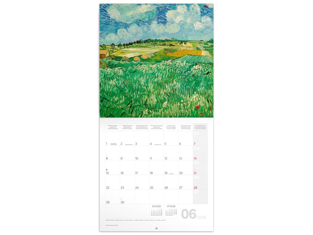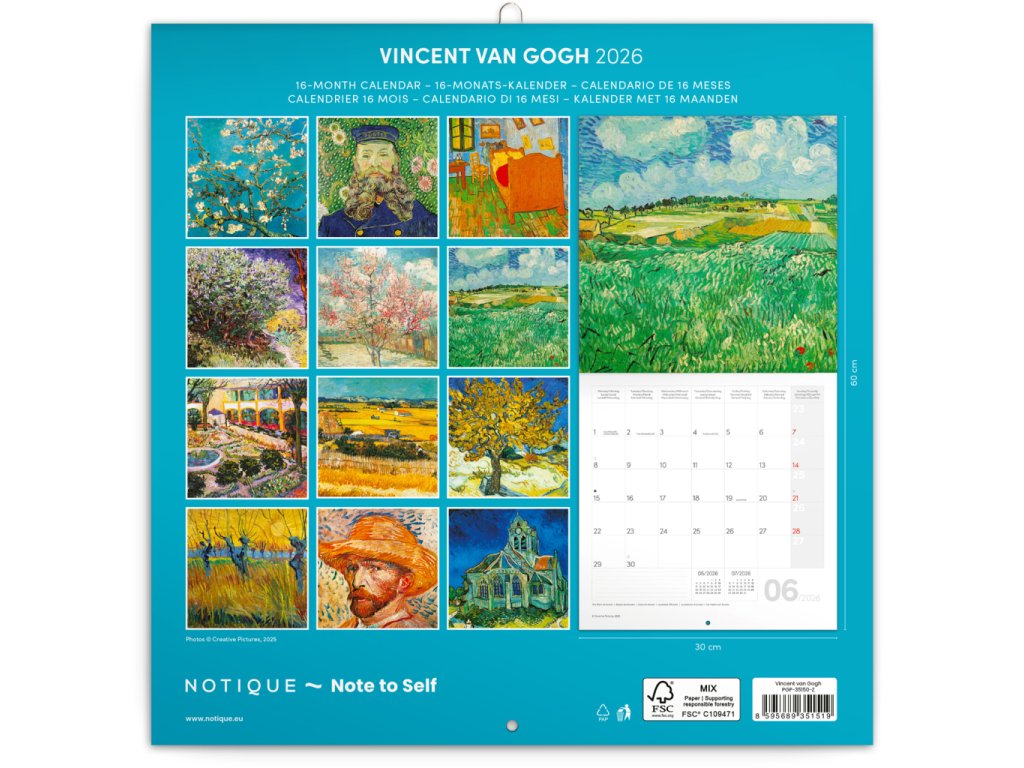 Buďte nablízku talentu malíře, jehož sláva přišla až s jeho smrtí. Obrazy legendárního umělce Vincenta van Gogha na stránkách poznámkového kalendáře. Obsahuje přehledné kalendárium od září 2025 do prosince 2026 v šesti jazycích, měsíční fáze, důležité svátky a prostor pro poznámky na každý den.