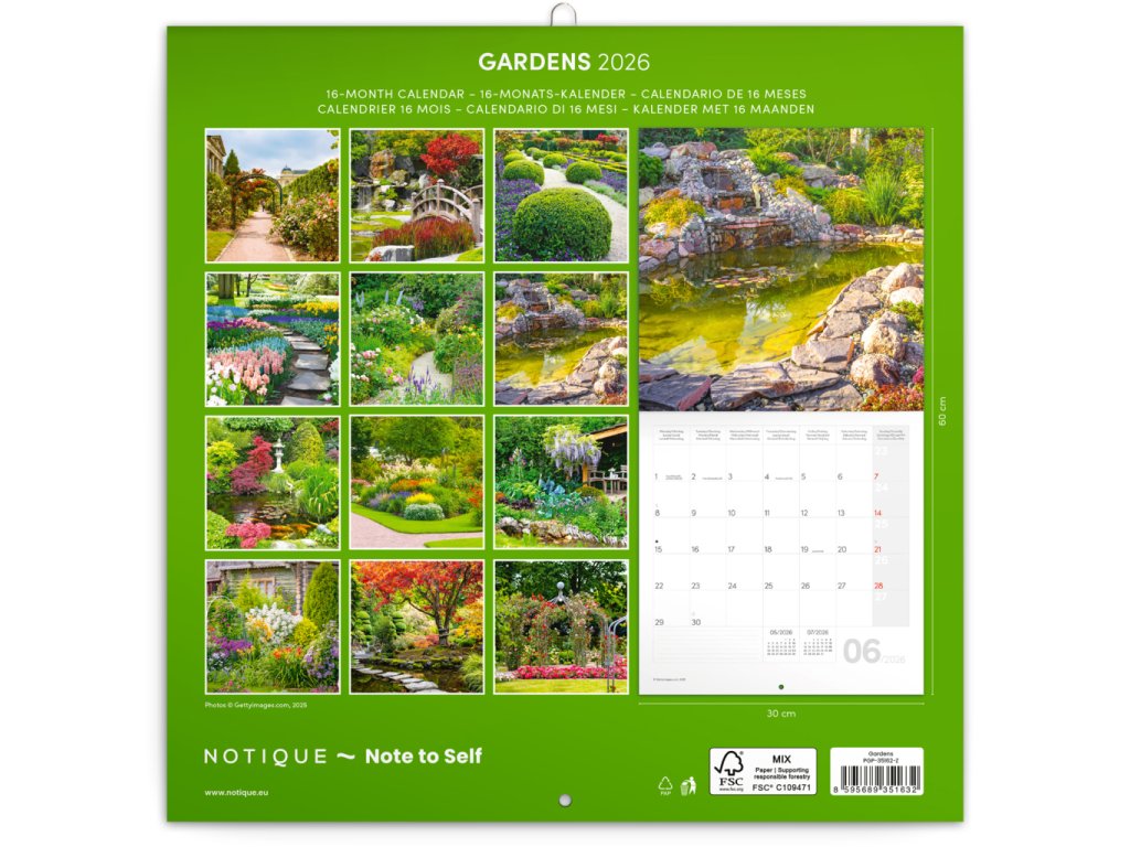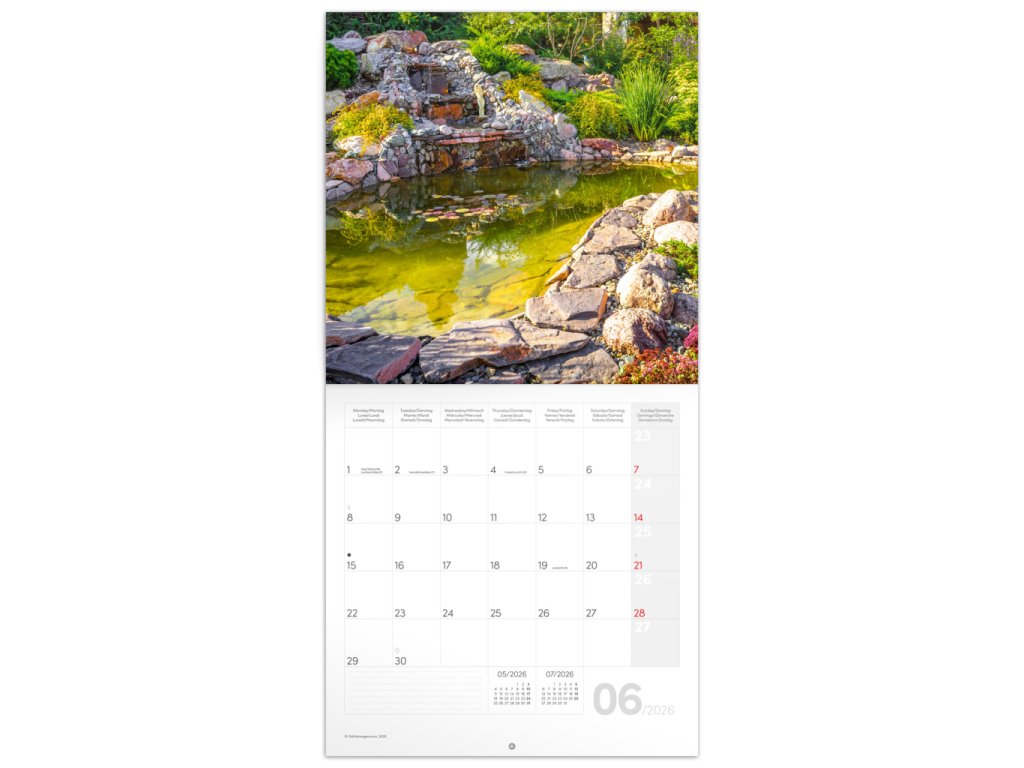 Rozjasněte svůj interiér barevnými fotografiemi šlechtěných zahrad. V kalendáři kromě fotek najdete přehledné kalendárium od září 2025 do prosince 2026 v šesti jazycích, měsíční fáze, důležité svátky a prostor pro poznámky na každý den.