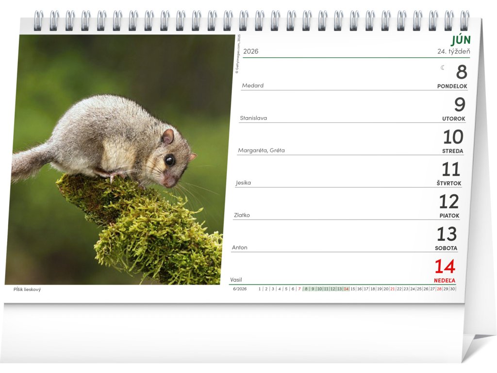 Oblíbený stolní kalendář obsahuje spoustu důležitých informací pro každého myslivce. Naleznete zde doby východu a západu slunce a měsíce na Slovensku, informace o aktivitách zvěře a přírodních aktualitách v průběhu roku a také přehled o době lovu srstnaté a pernaté zvěře. Tyto praktické informace doplňují nádherné fotky divoké zvěře od fotografa Miroslava Hlávka a kalendárium se slovenskými jmény, svátky a památnými dny.