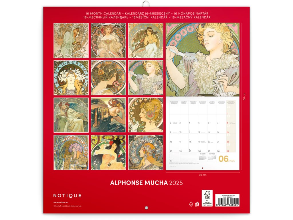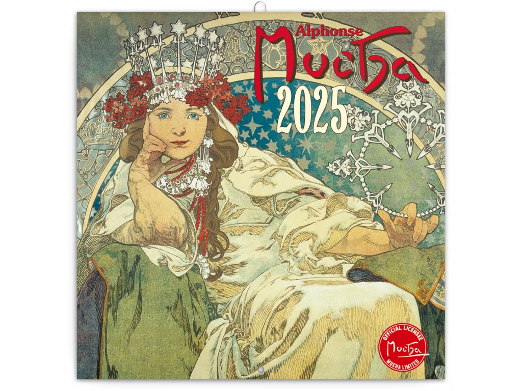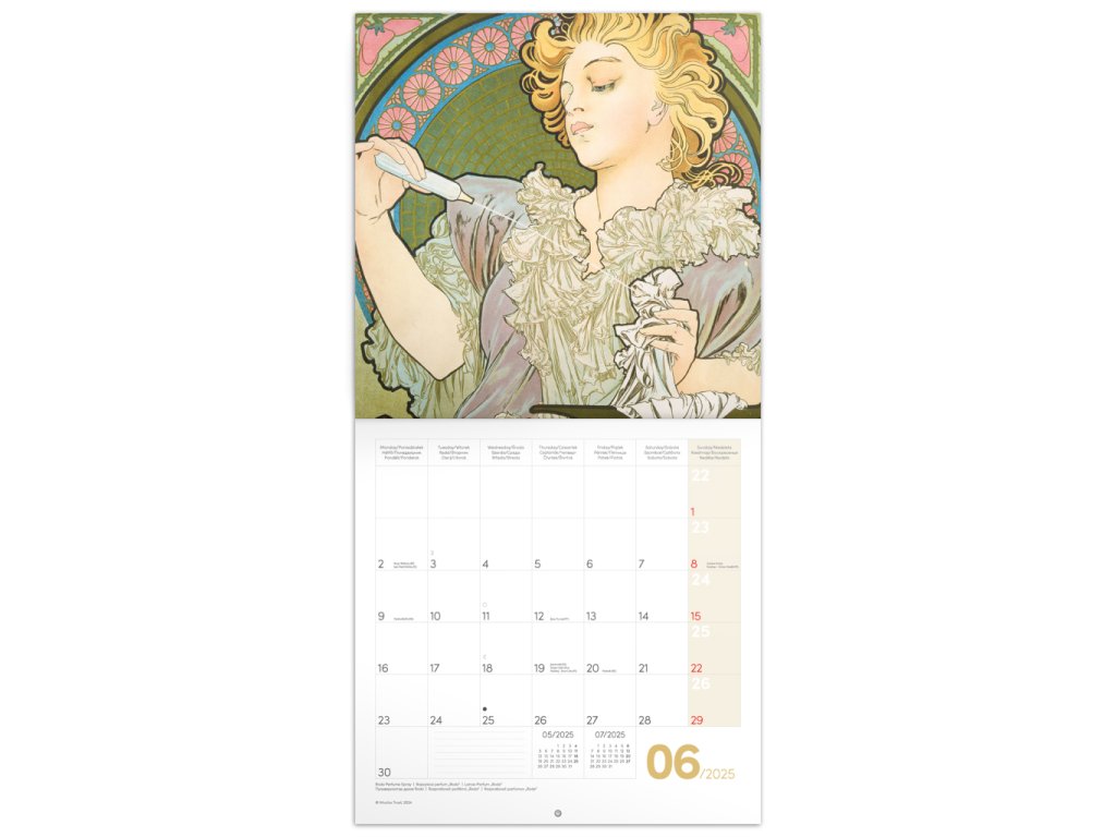 Poznámkový kalendář s reprodukcemi nejznámějších obrazů českého secesního malíře Alfonse Muchy, známého nejen svou tvorbou plakátů se Sarah Bernhardtovou. Obsahuje přehledné kalendárium od září 2024 do prosince 2025 v šesti jazycích, fáze měsíce, důl...