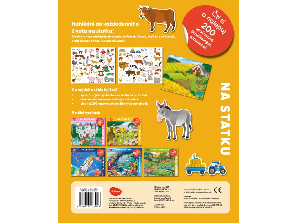 Užijte si spoustu zábavy s úžasnými adhezivními samolepkami, díky nimž stvoříte svůj vlastní venkovský svět! V téhle knížce jich objevíte více než dvě stovky a můžete s jejich pomocí donekonečna dotvářet překrásné celostránkové obrázky, k nimž samolepky jednoduše přilnou. Vedle toho tu najdete také poutavý text plný zajímavých informací o každodenním životě na statku. Zavítáte do světa hospodářských zvířat, plodin a lidí, kteří se o ně starají.