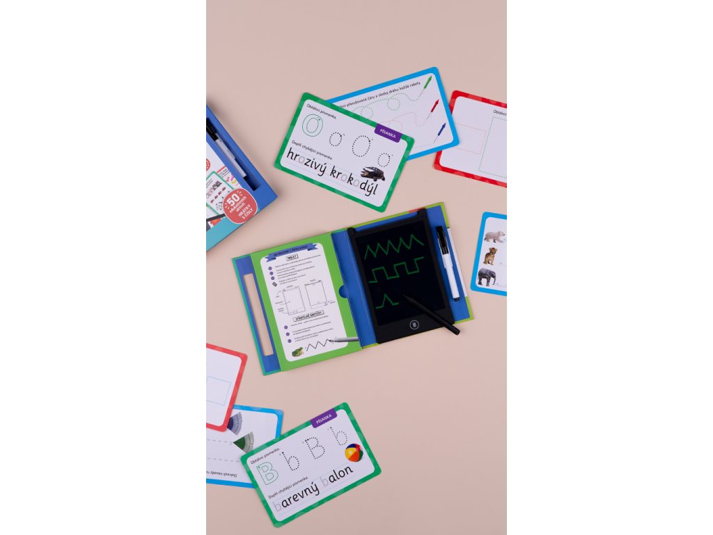 Set 25 stíratelných kartiček edukativních aktivit s přiloženým fixem a kouzelným tabletem je ten nejrafinovanější a zároveň nejzábavnější způsob, jak s předškoláčky vykročit na cestu za poznáváním písmenek a prvního psaní!